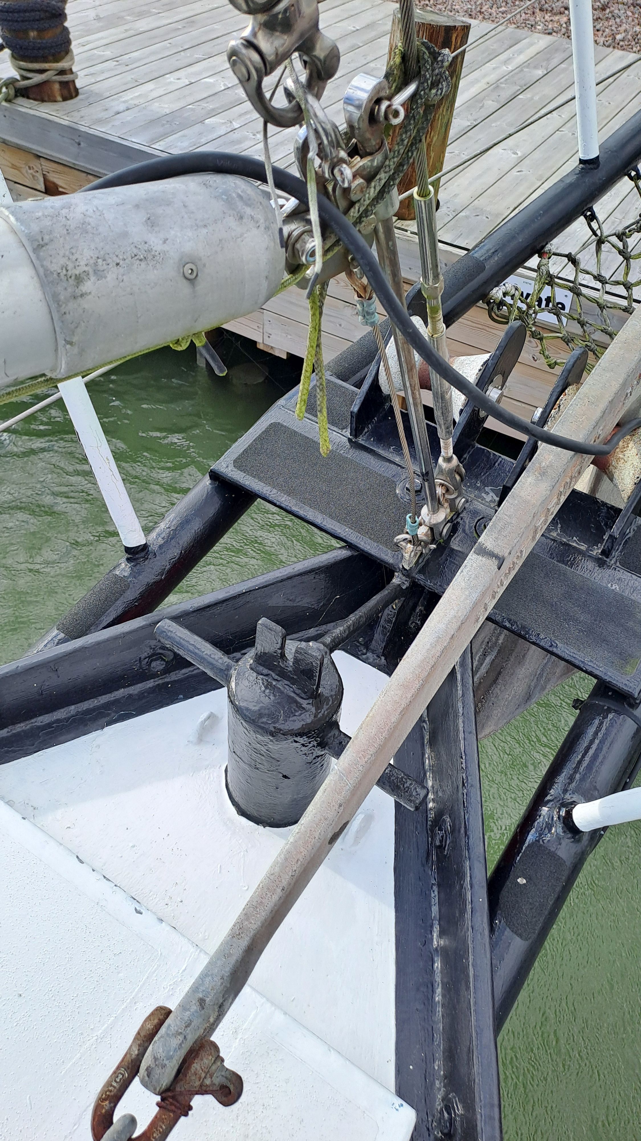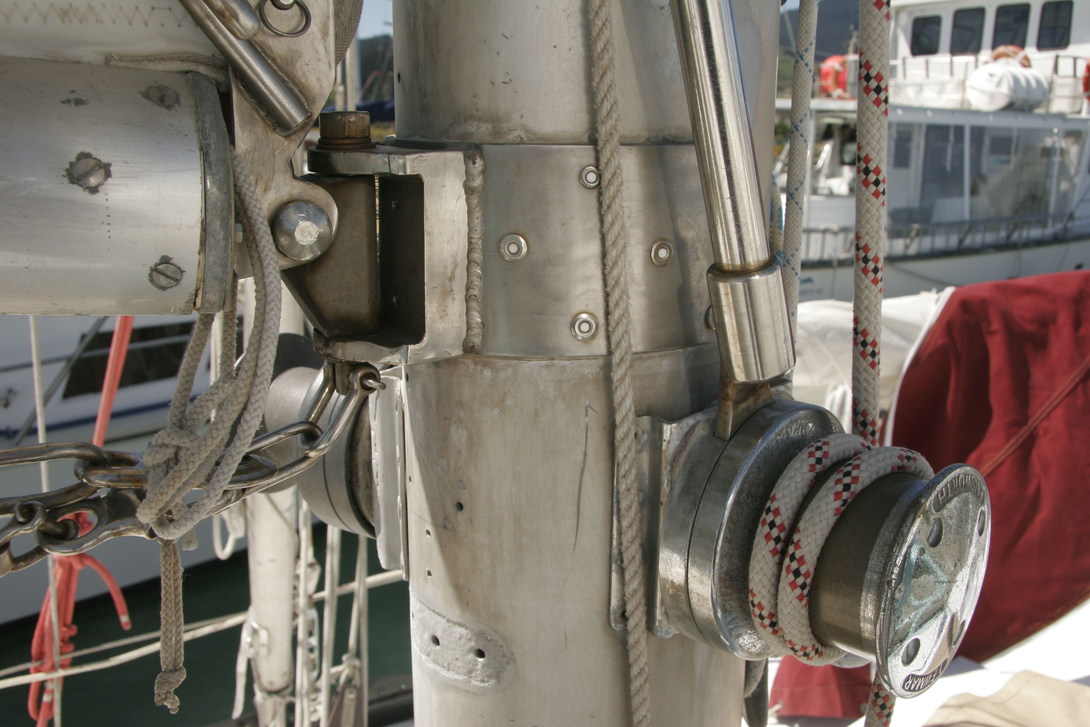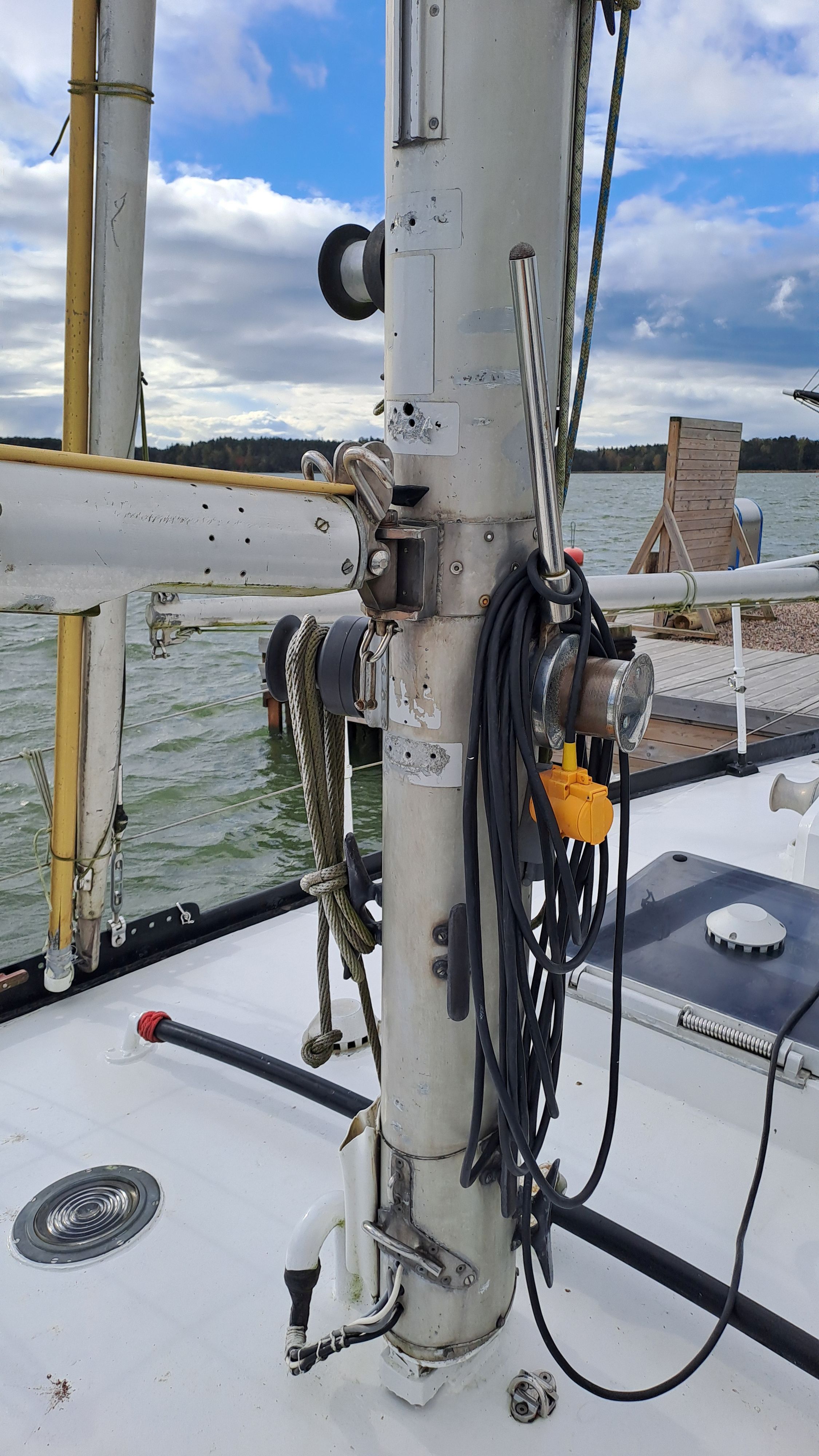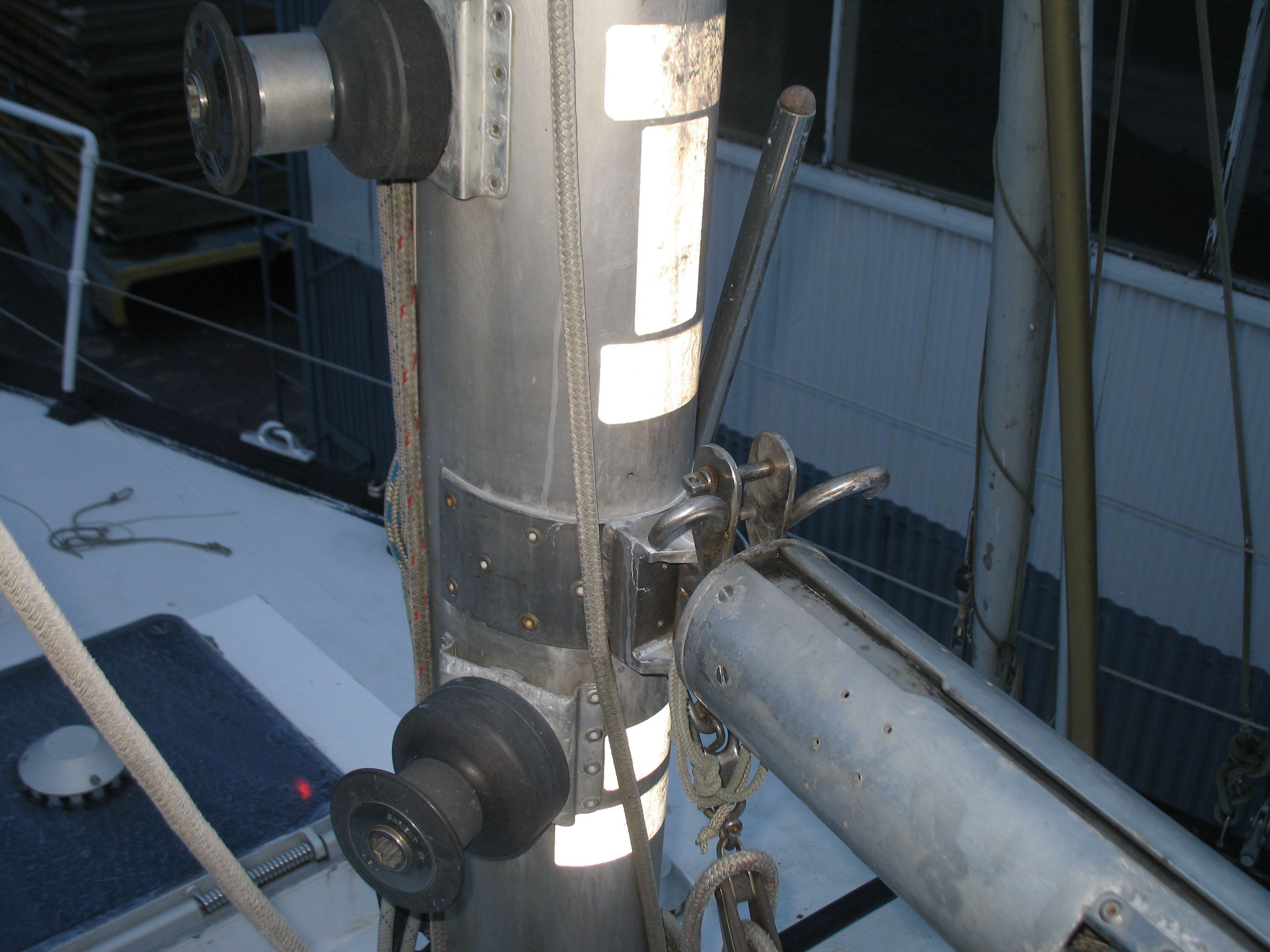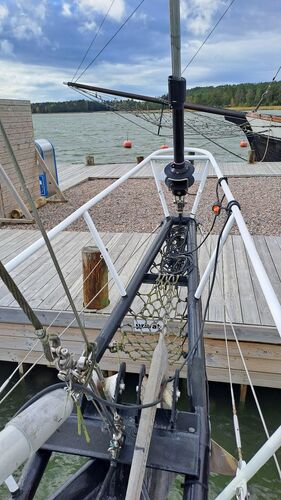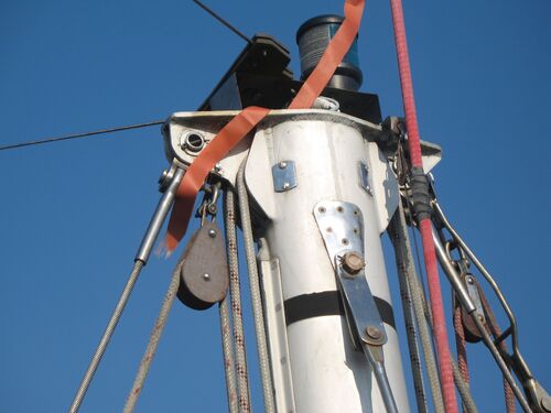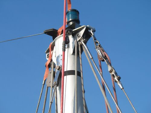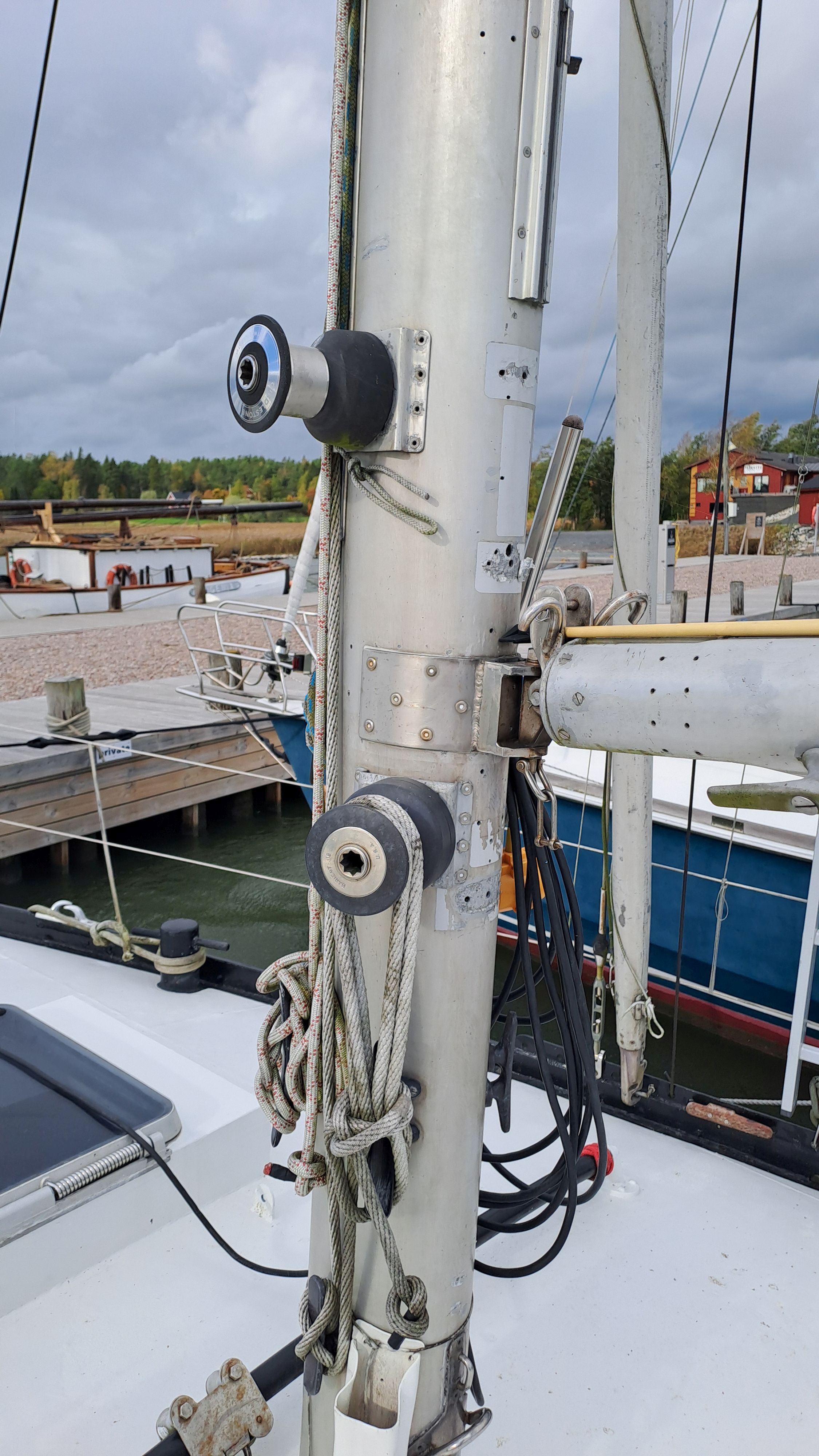 Both masts are equipped with traditional drum winches. The blocks are made of stainless steel—the same type used by trawler fishermen.