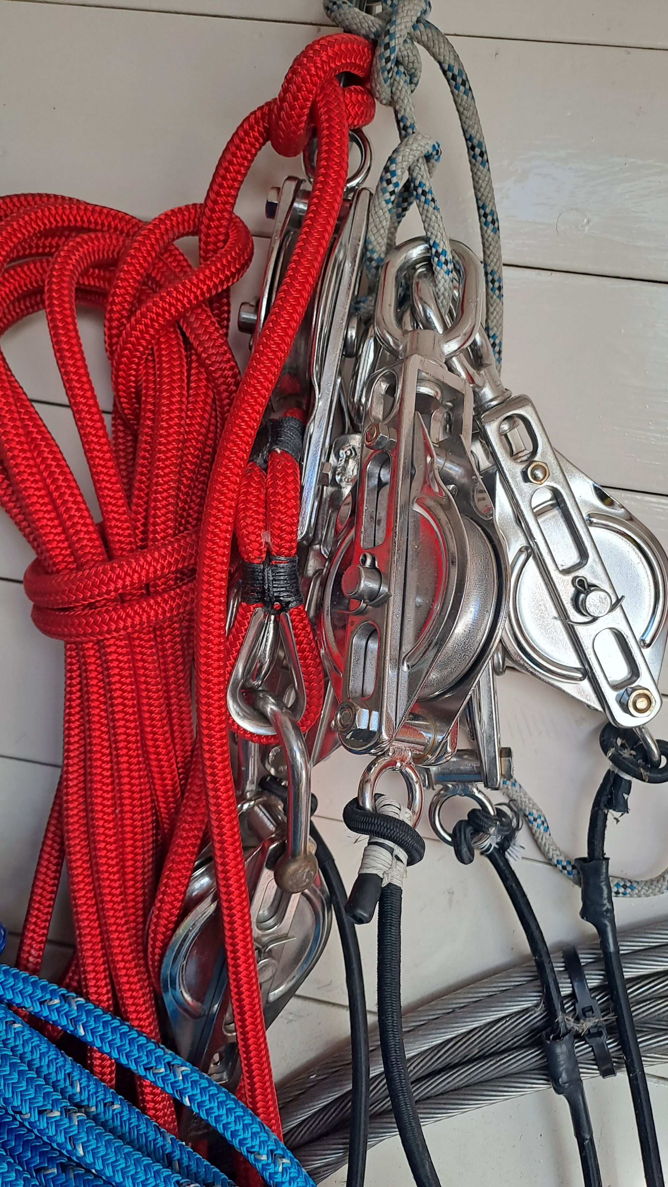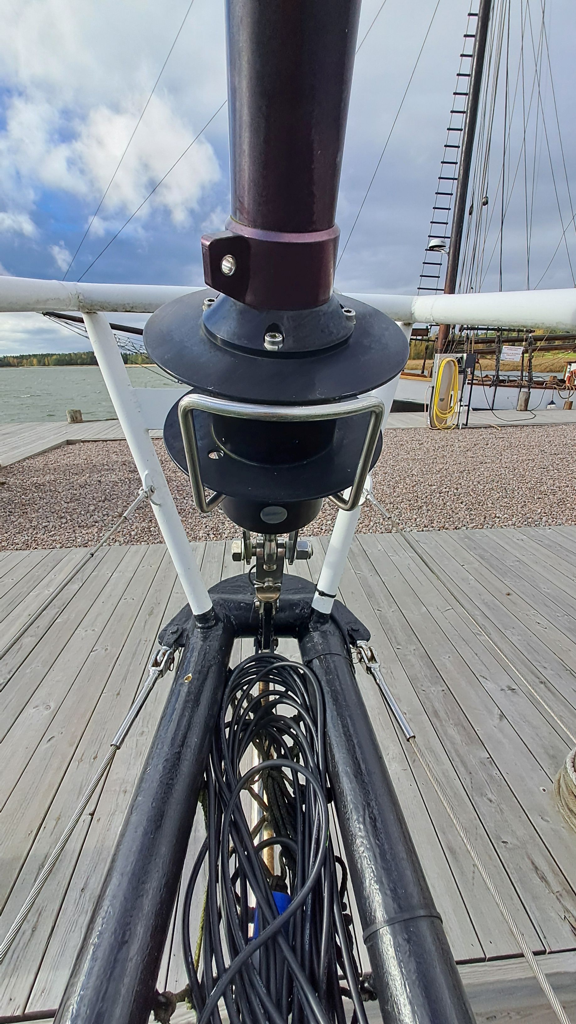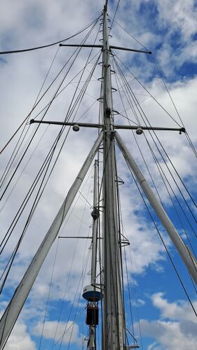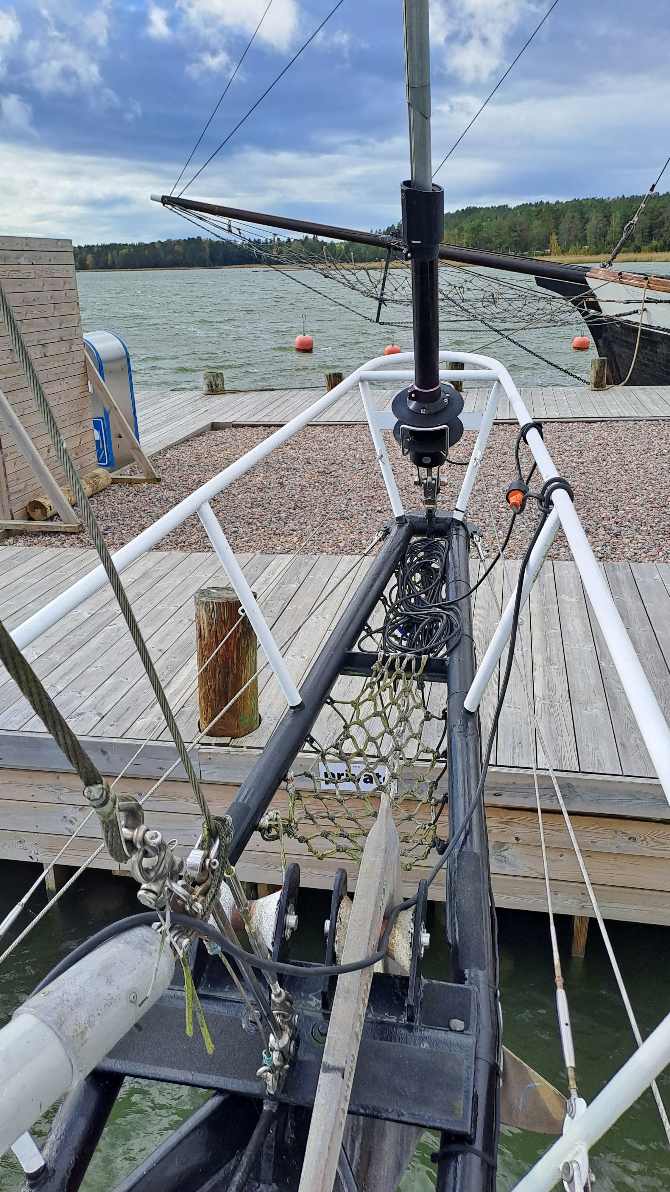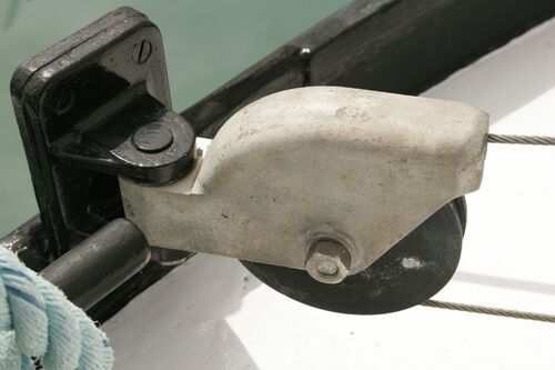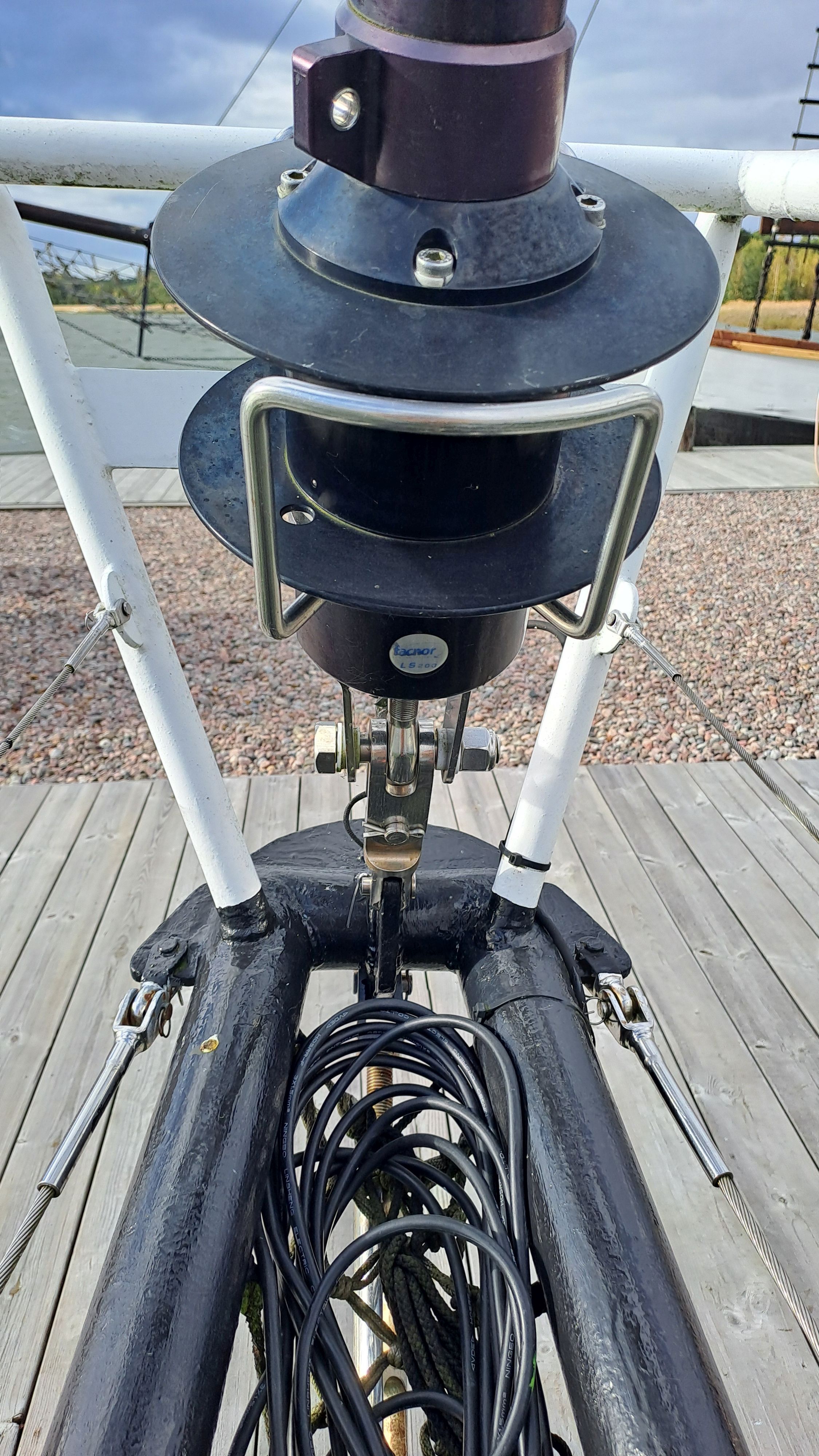 Both masts are equipped with traditional drum winches. The blocks are made of stainless steel—the same type used by trawler fishermen.