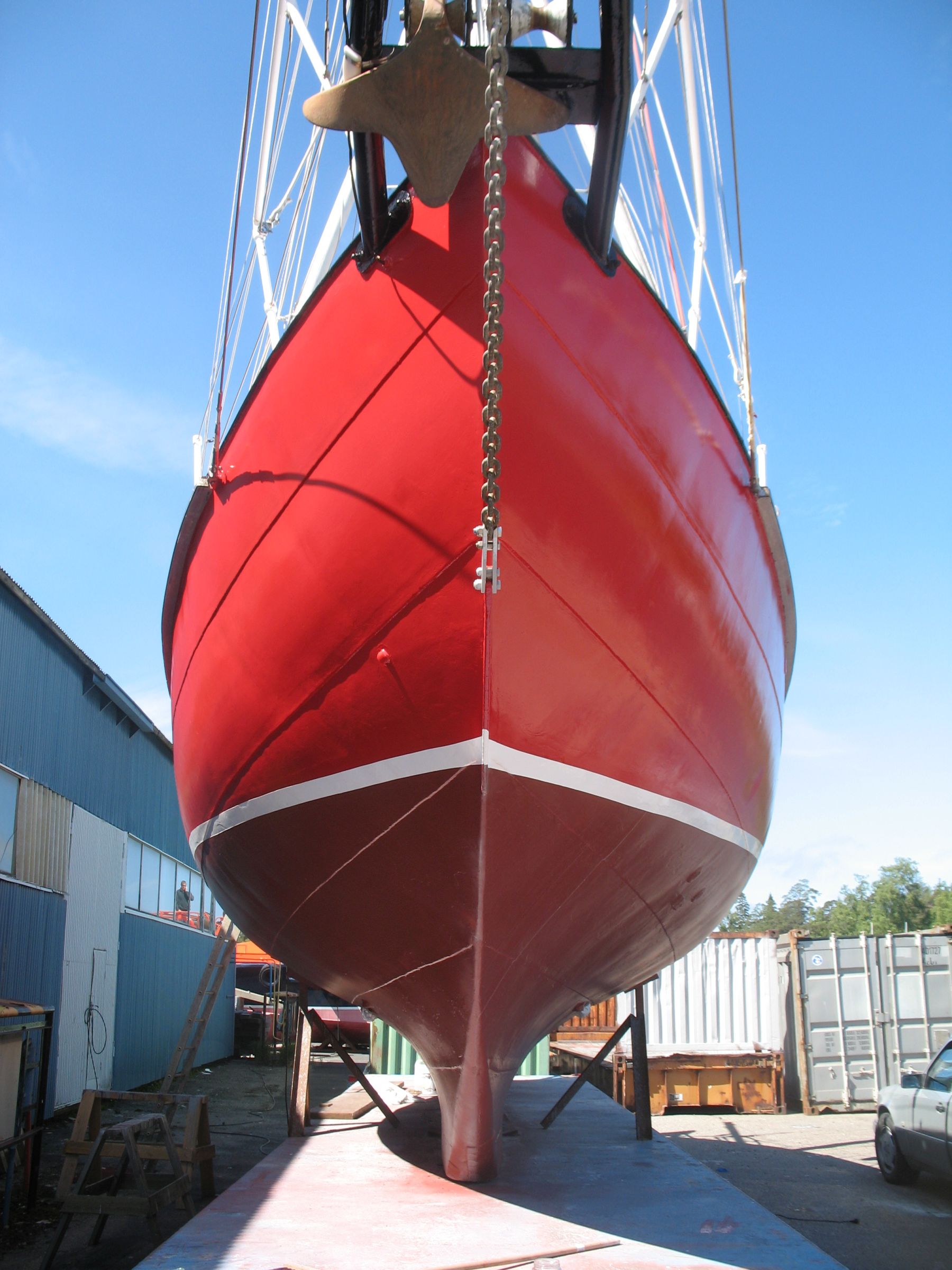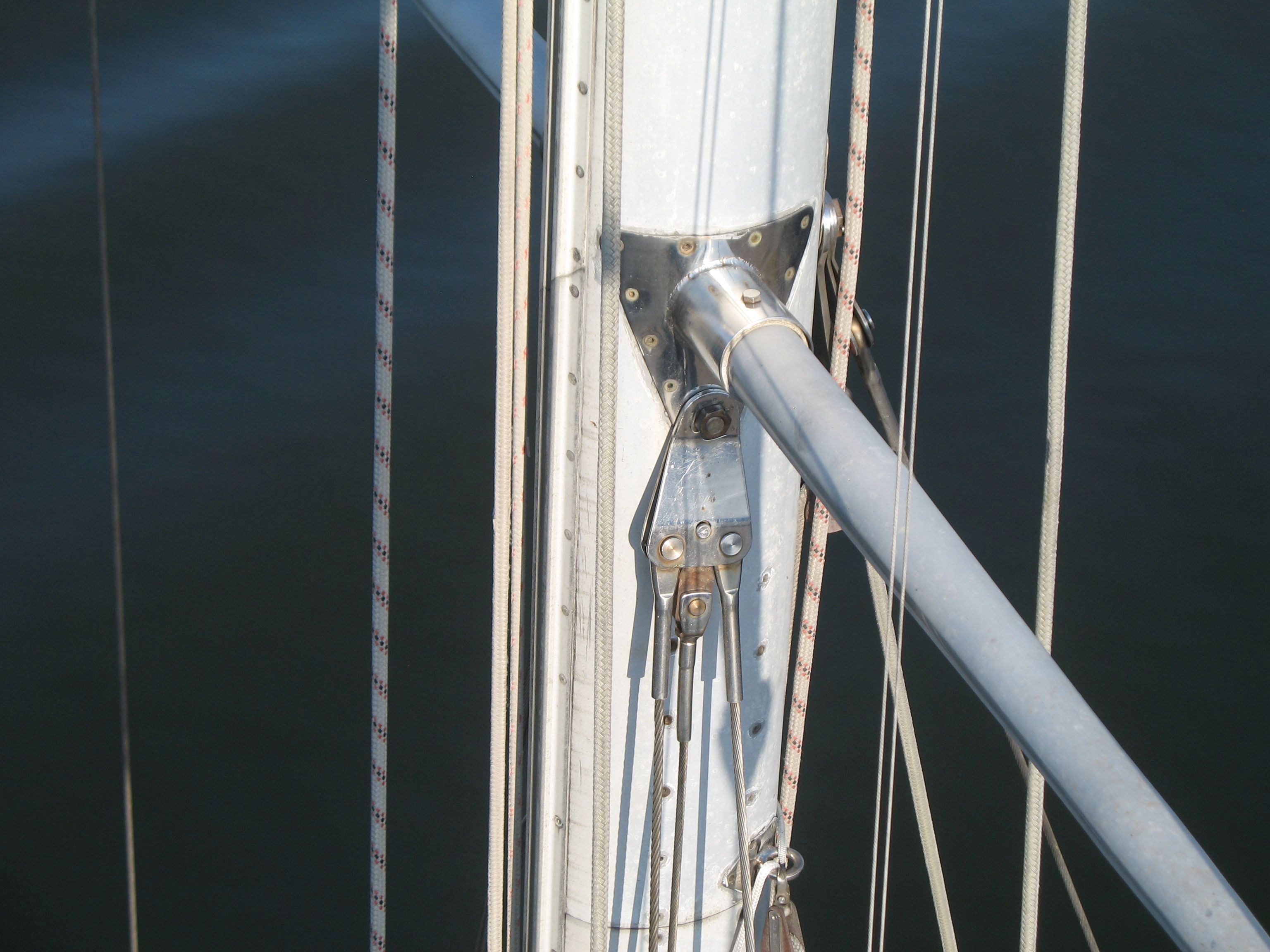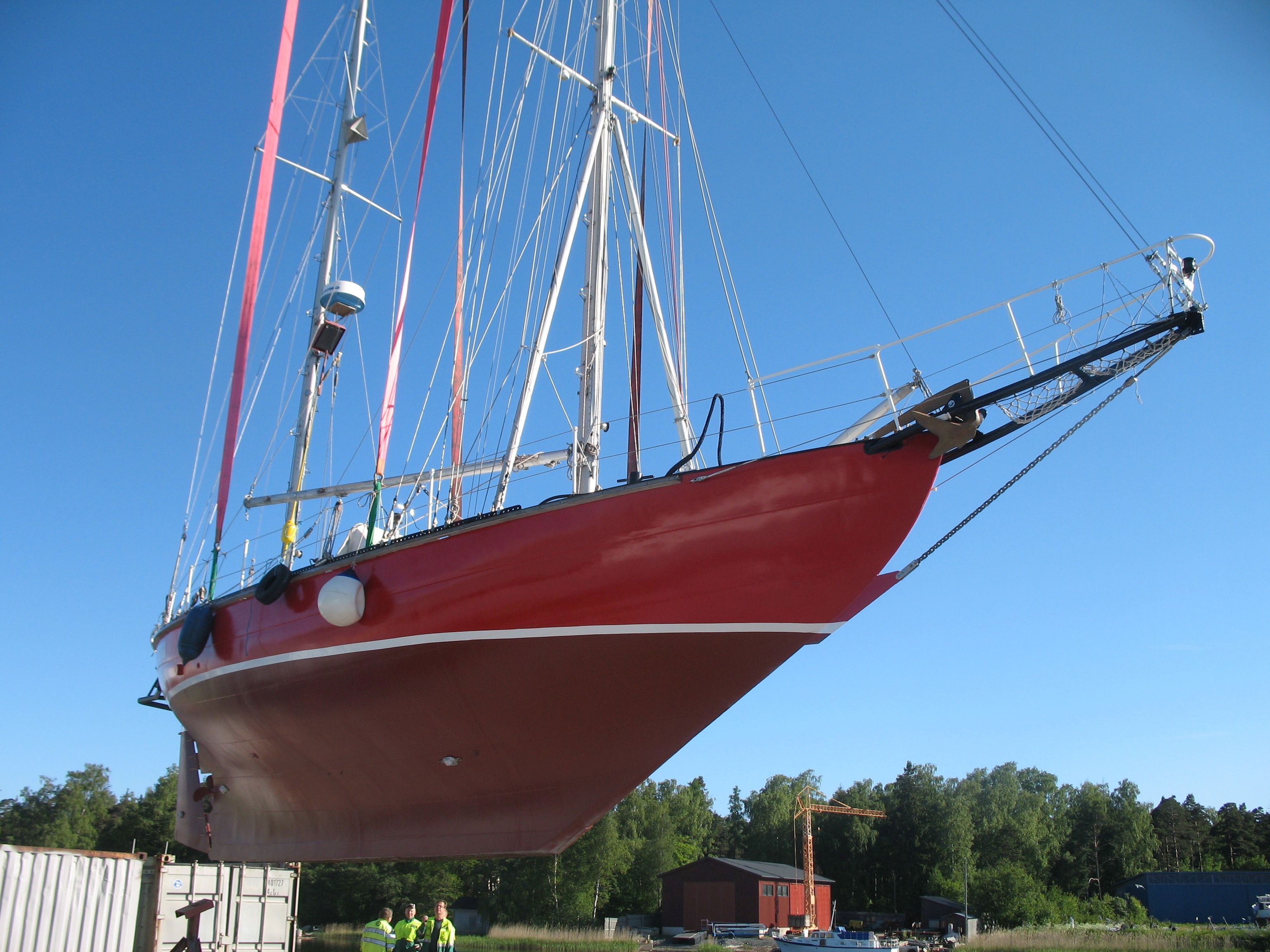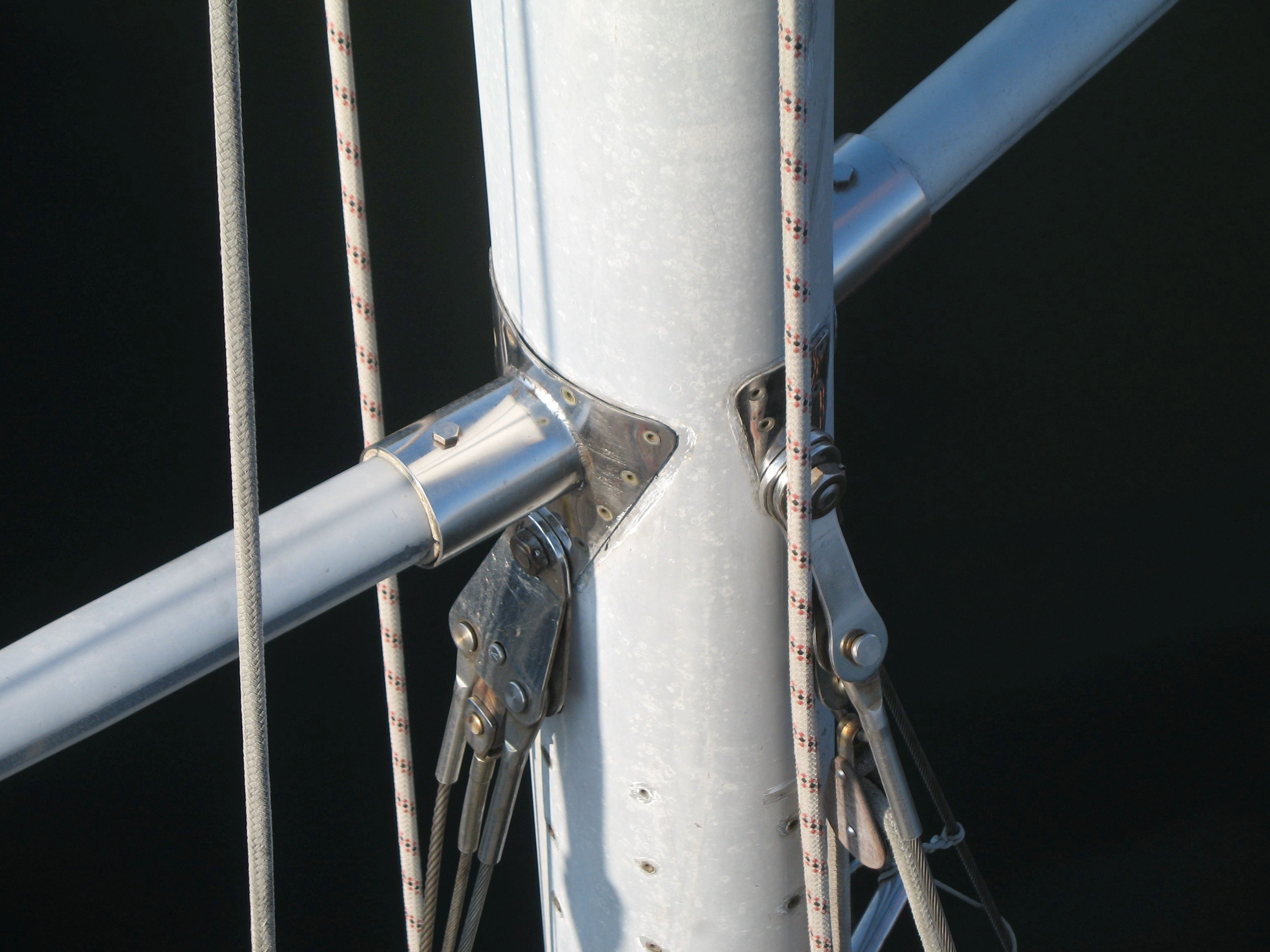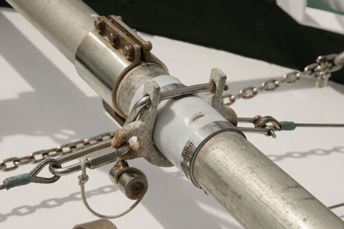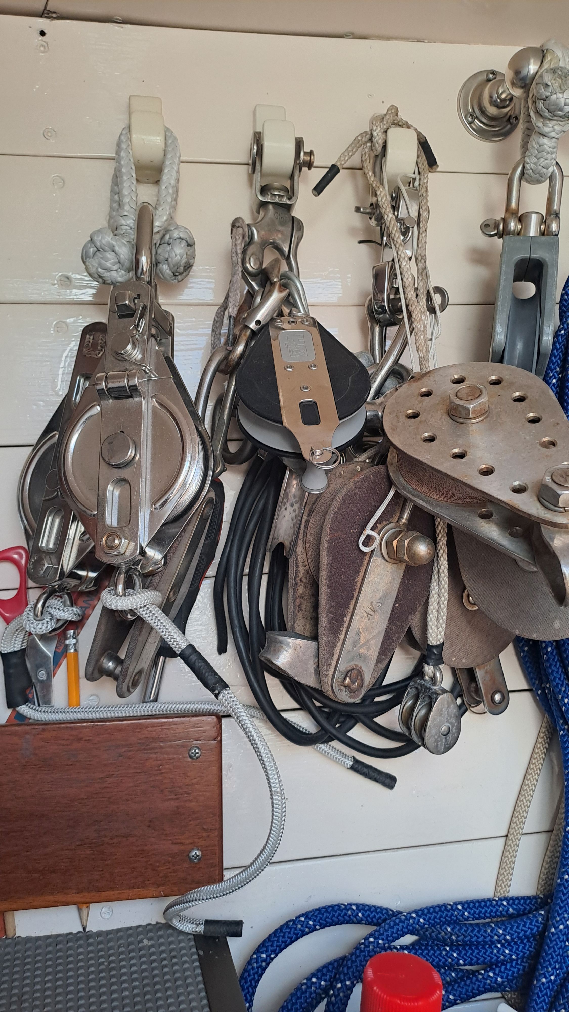 Both masts are equipped with traditional drum winches. The blocks are made of stainless steel—the same type used by trawler fishermen.