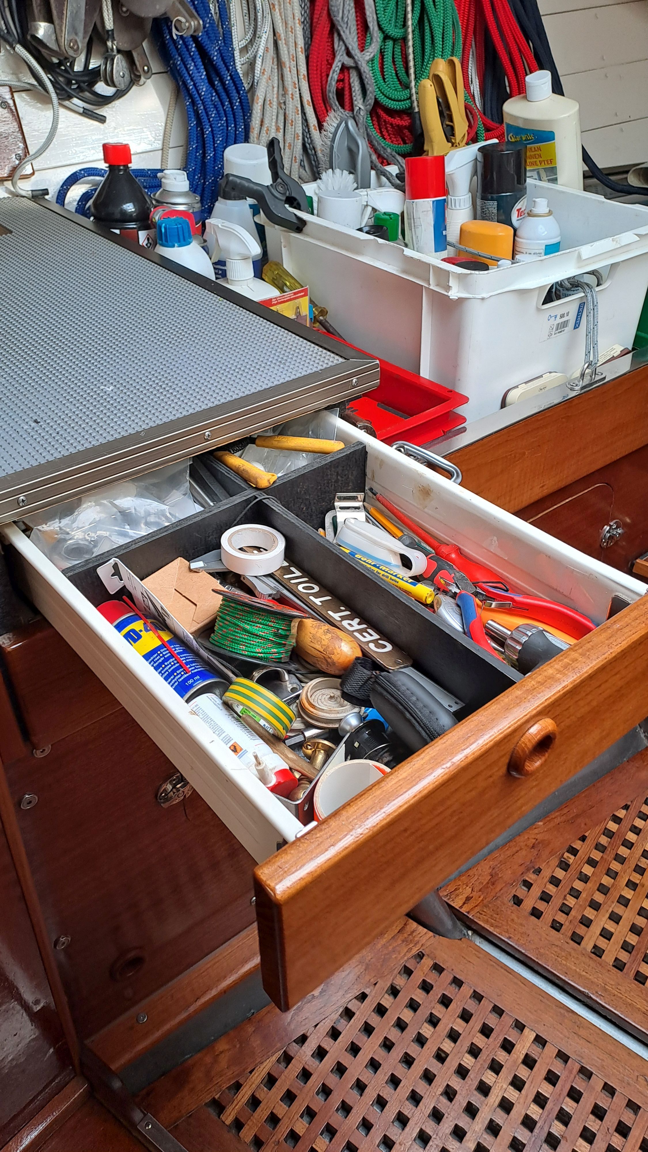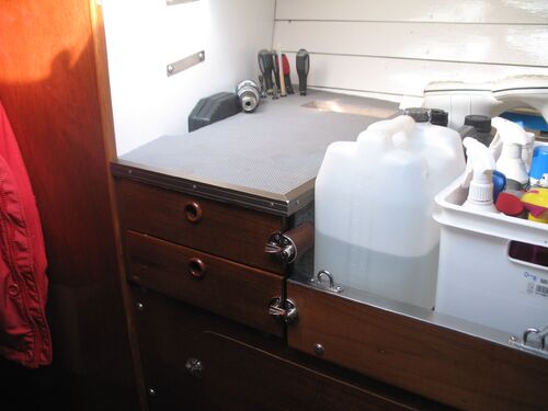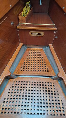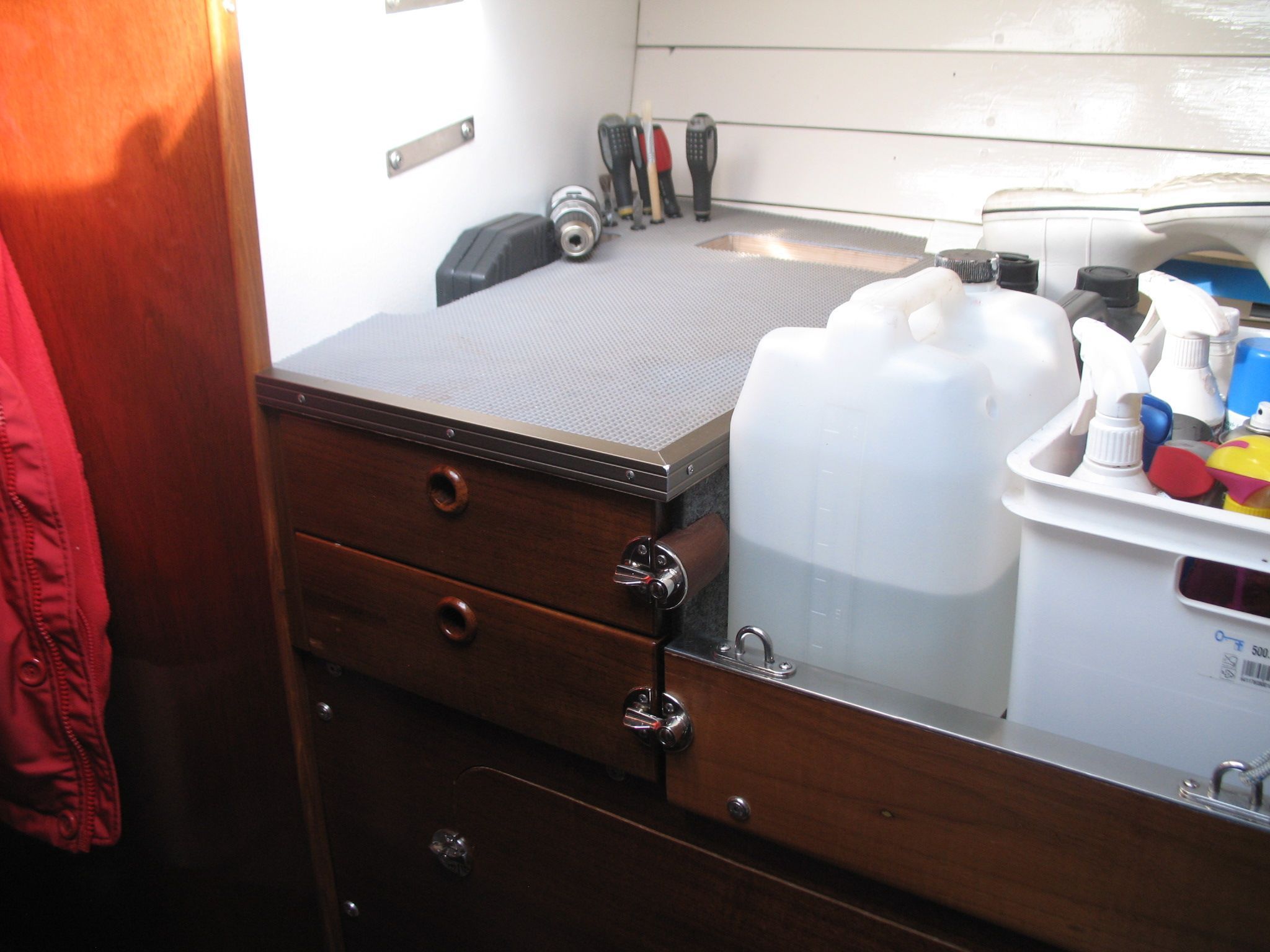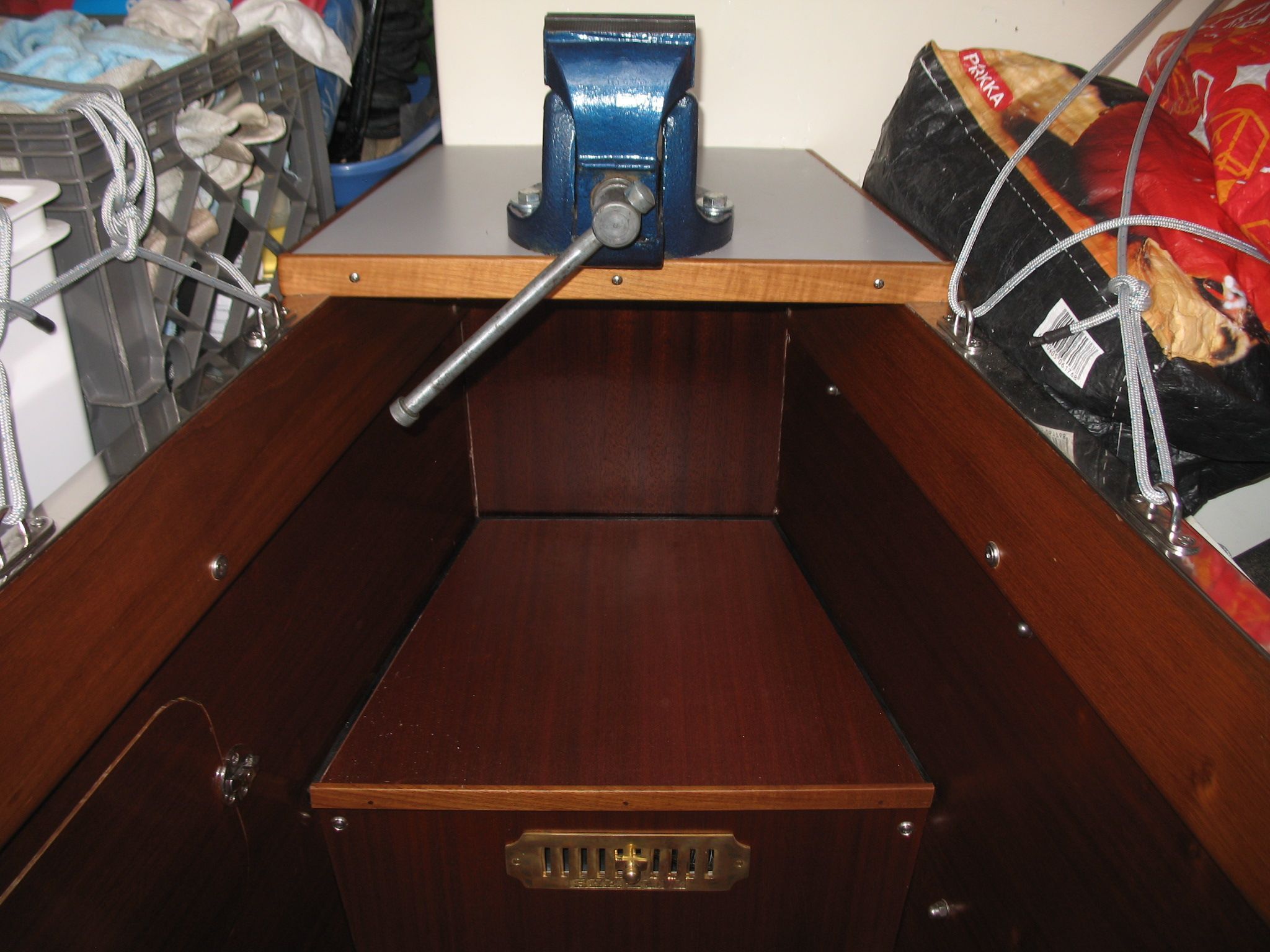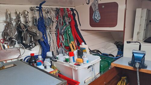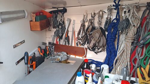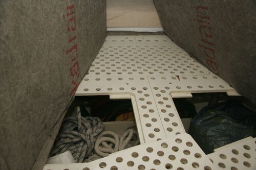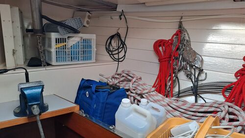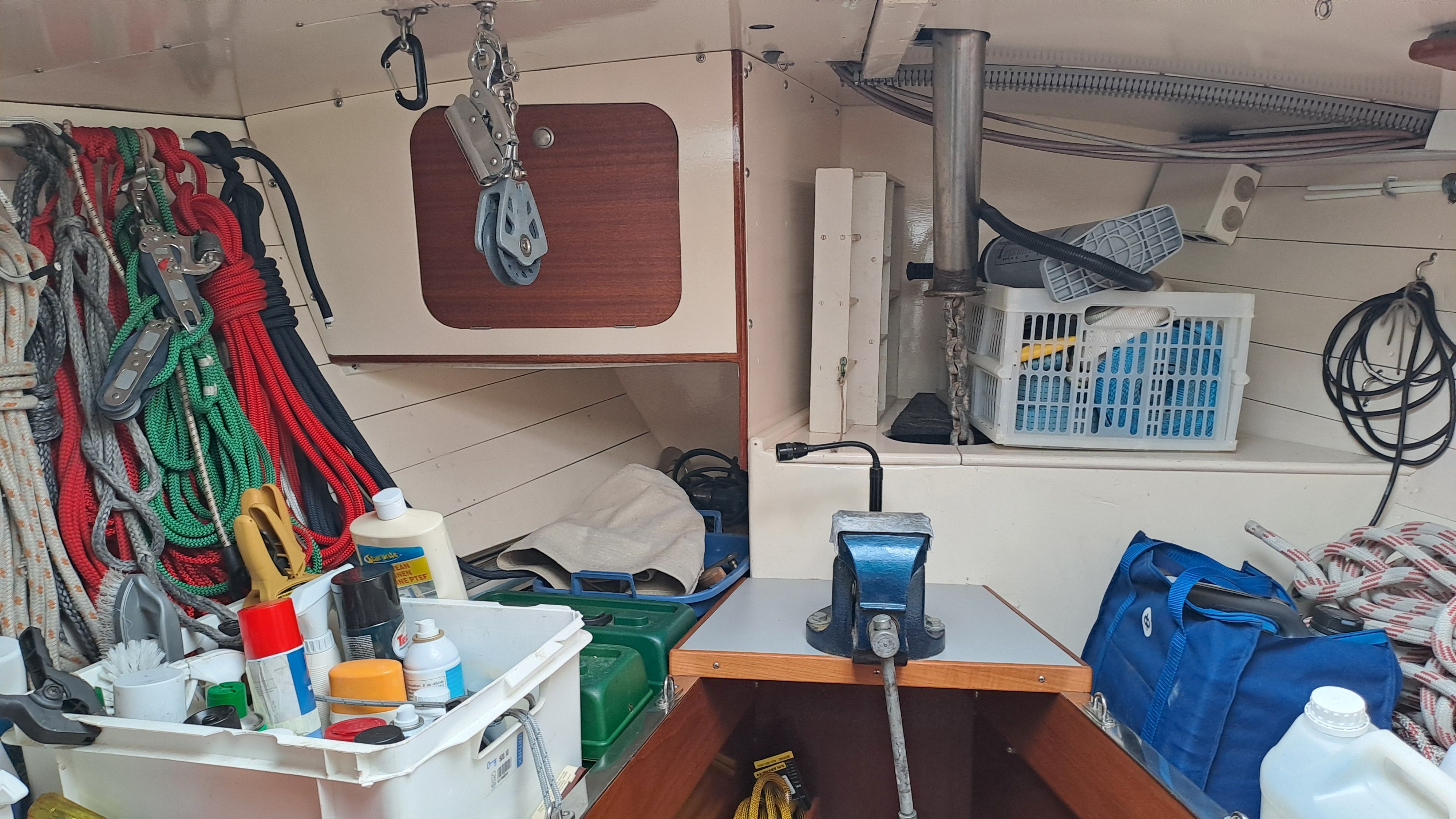 The anchor chain is stored in a fiberglass locker with a drain valve at the bottom for water removal. The space between the locker and the hull can be cleaned. Currently, the bow serves entirely as storage and a workshop. The photos probably explain everything.