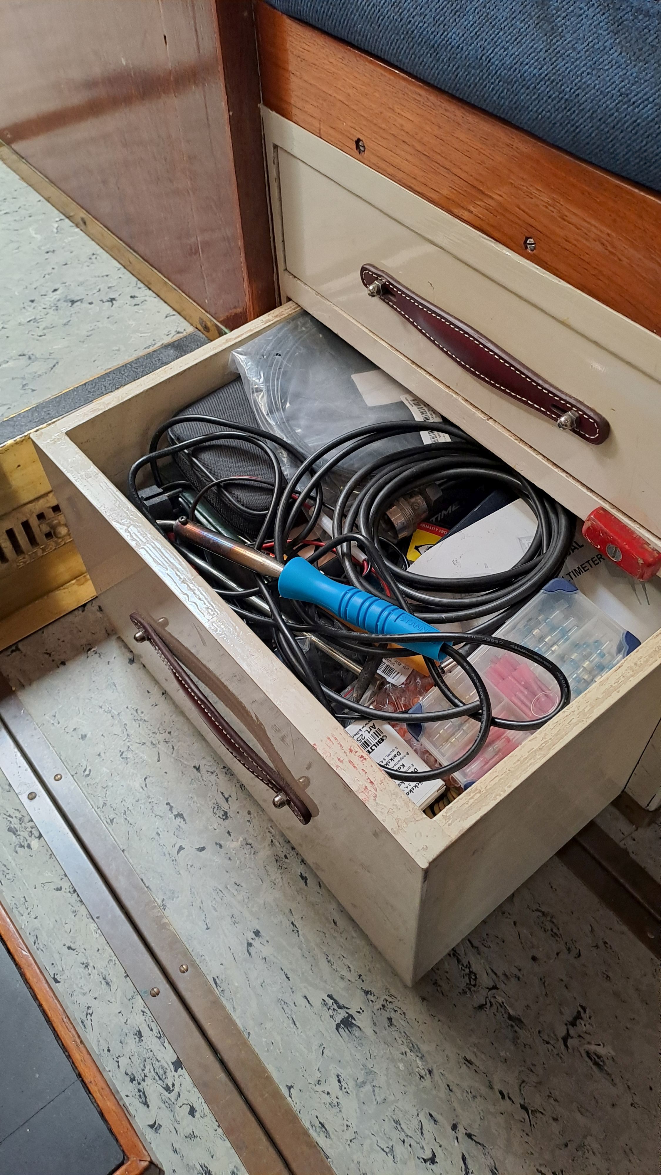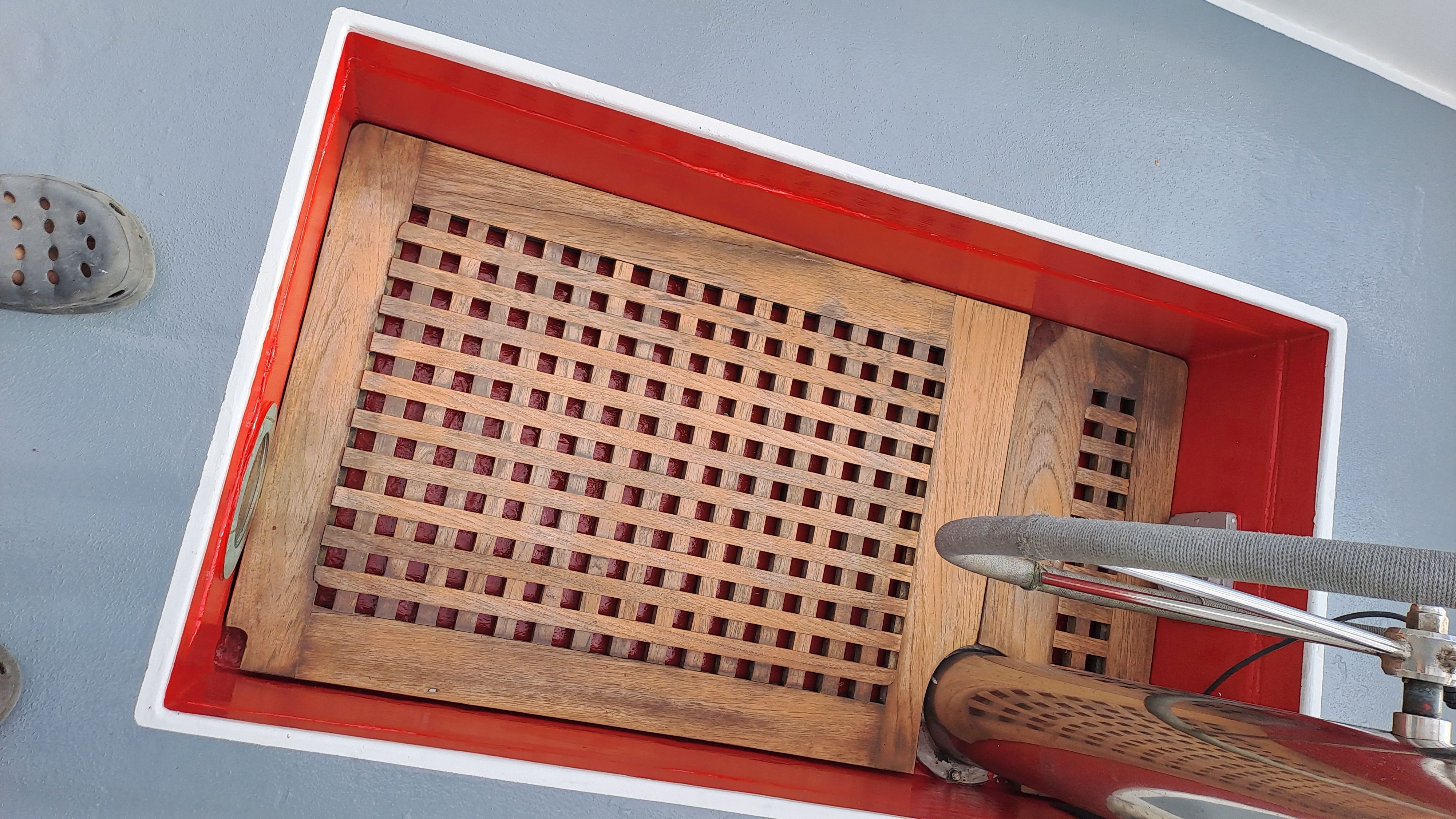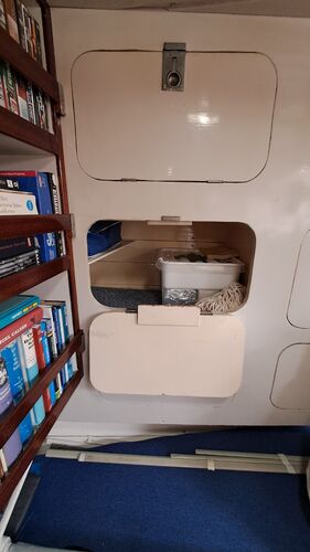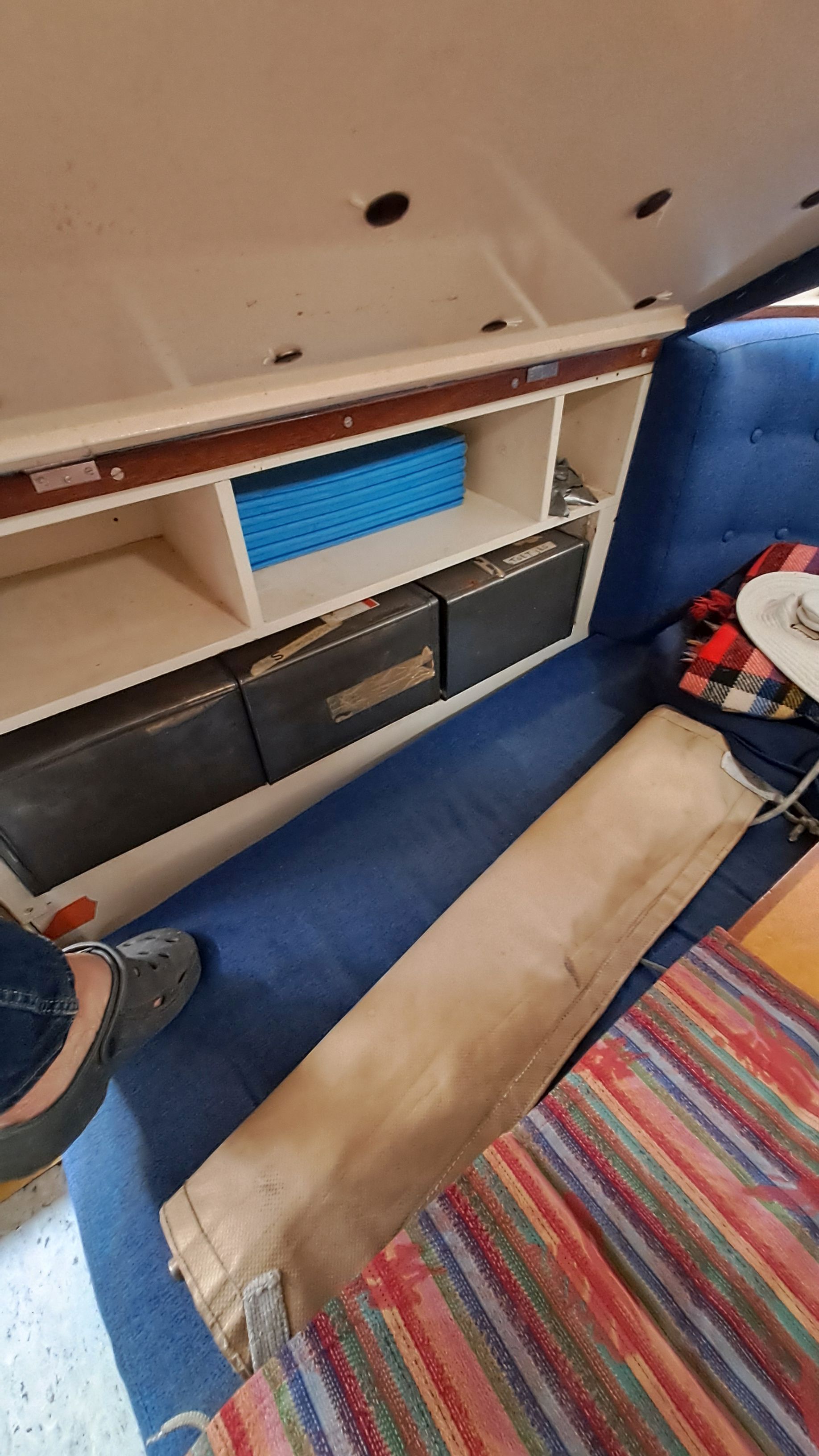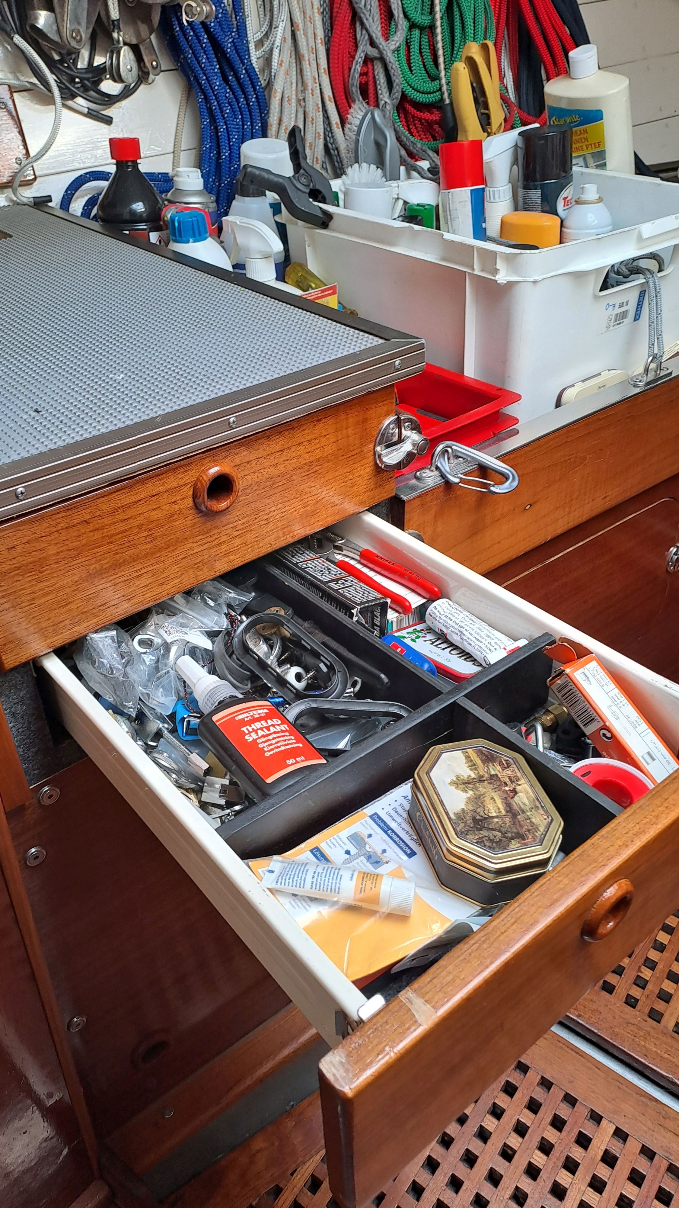 The anchor chain is stored in a fiberglass locker with a drain valve at the bottom for water removal. The space between the locker and the hull can be cleaned. Currently, the bow serves entirely as storage and a workshop. The photos probably explain everything.