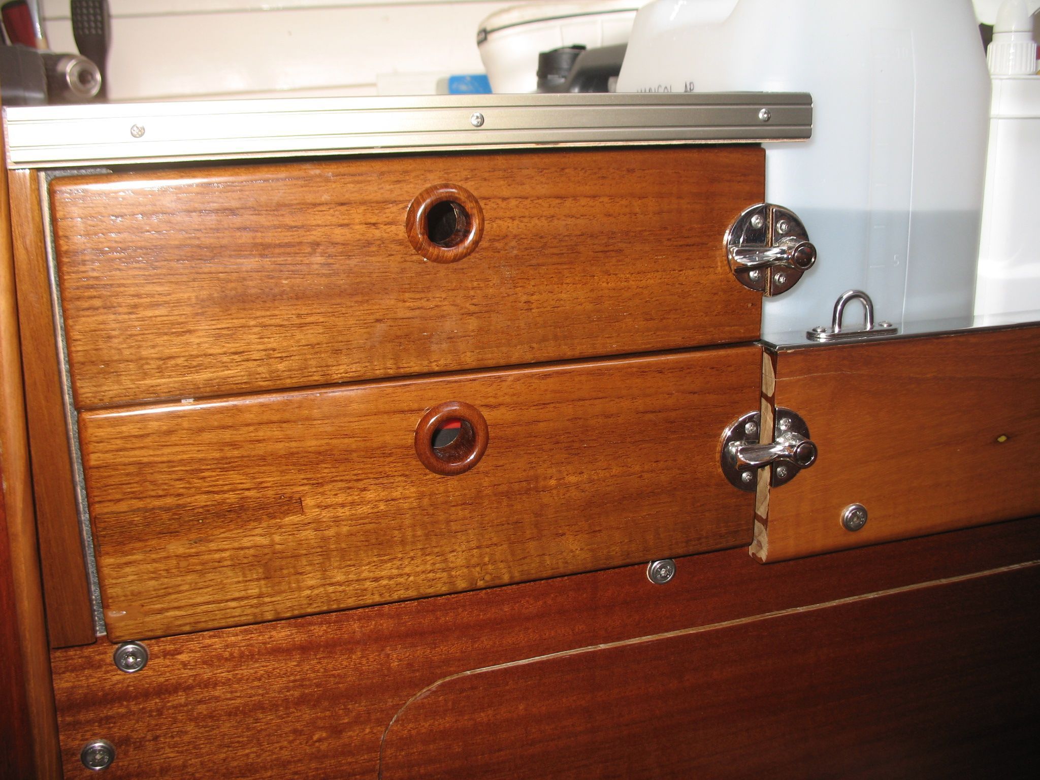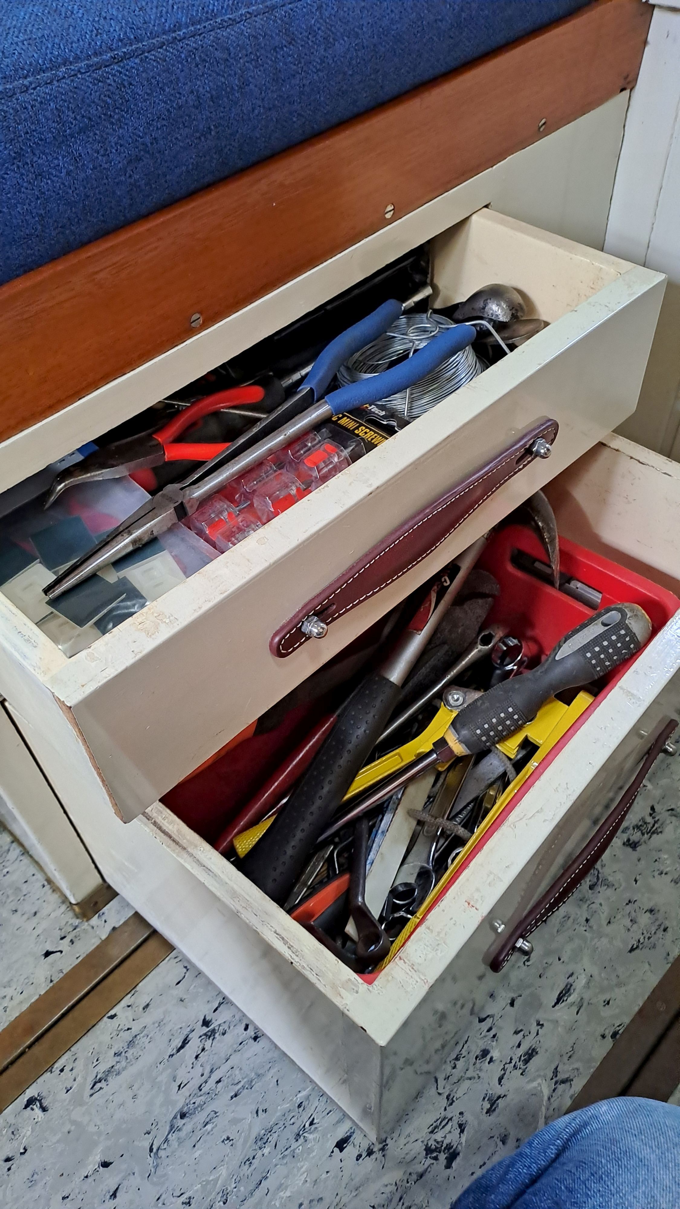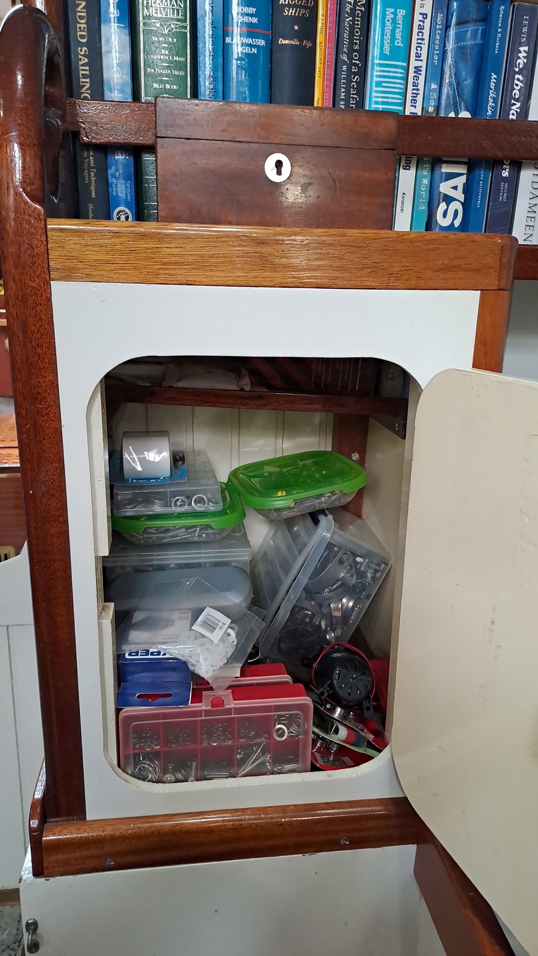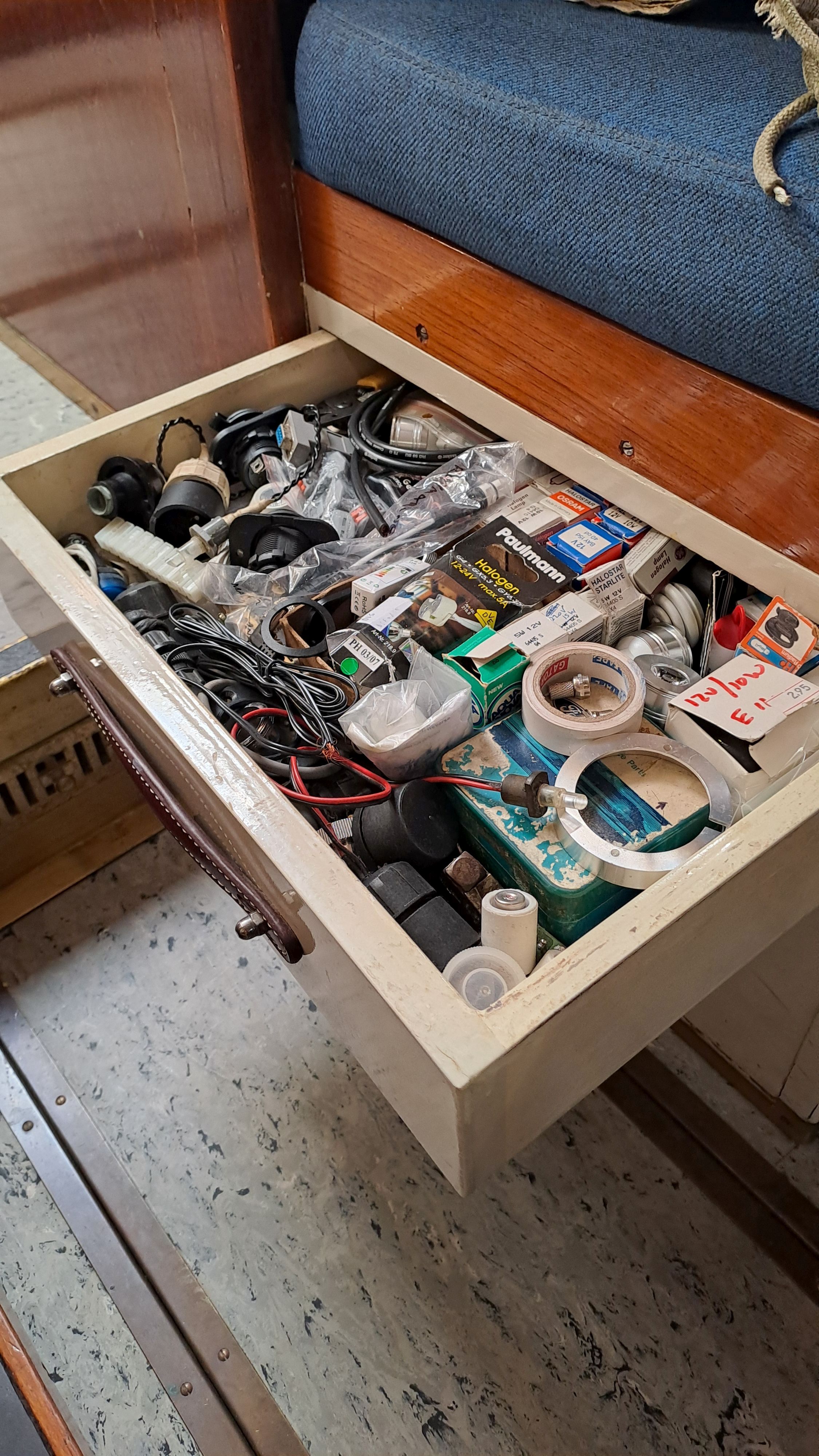 The anchor chain is stored in a fiberglass locker with a drain valve at the bottom for water removal. The space between the locker and the hull can be cleaned. Currently, the bow serves entirely as storage and a workshop. The photos probably explain everything.