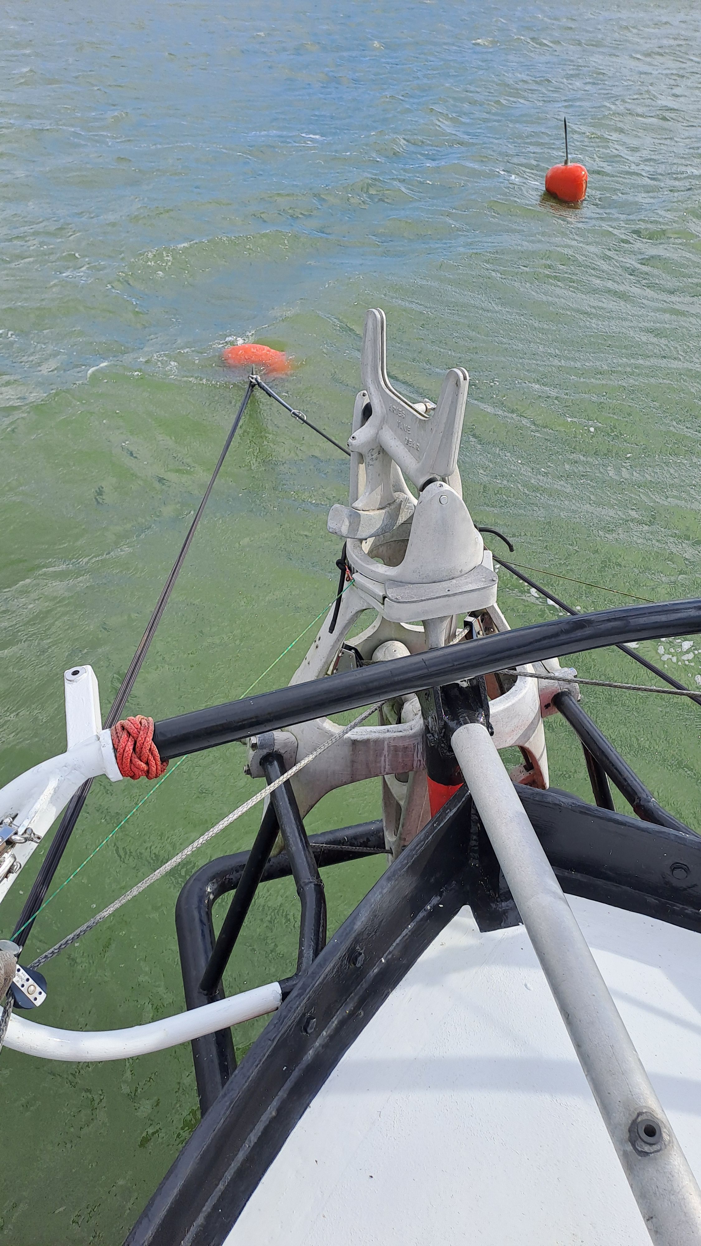 The windlass is manufactured by the Italian company Orvea. The anchor chain is galvanized and an impressive 13 mm thick, with 75 meters stored in its dedicated locker. The chain is marked, and its other end is secured to the boat with a rope loop, allowing it to be sacrified in an emergency. The main anchor is a genuine 50 kg Bruce. A second anchor is stored in the bow locker and can also be used as a stern anchor. There is a dedicated roller for it and for a drogue anchor.