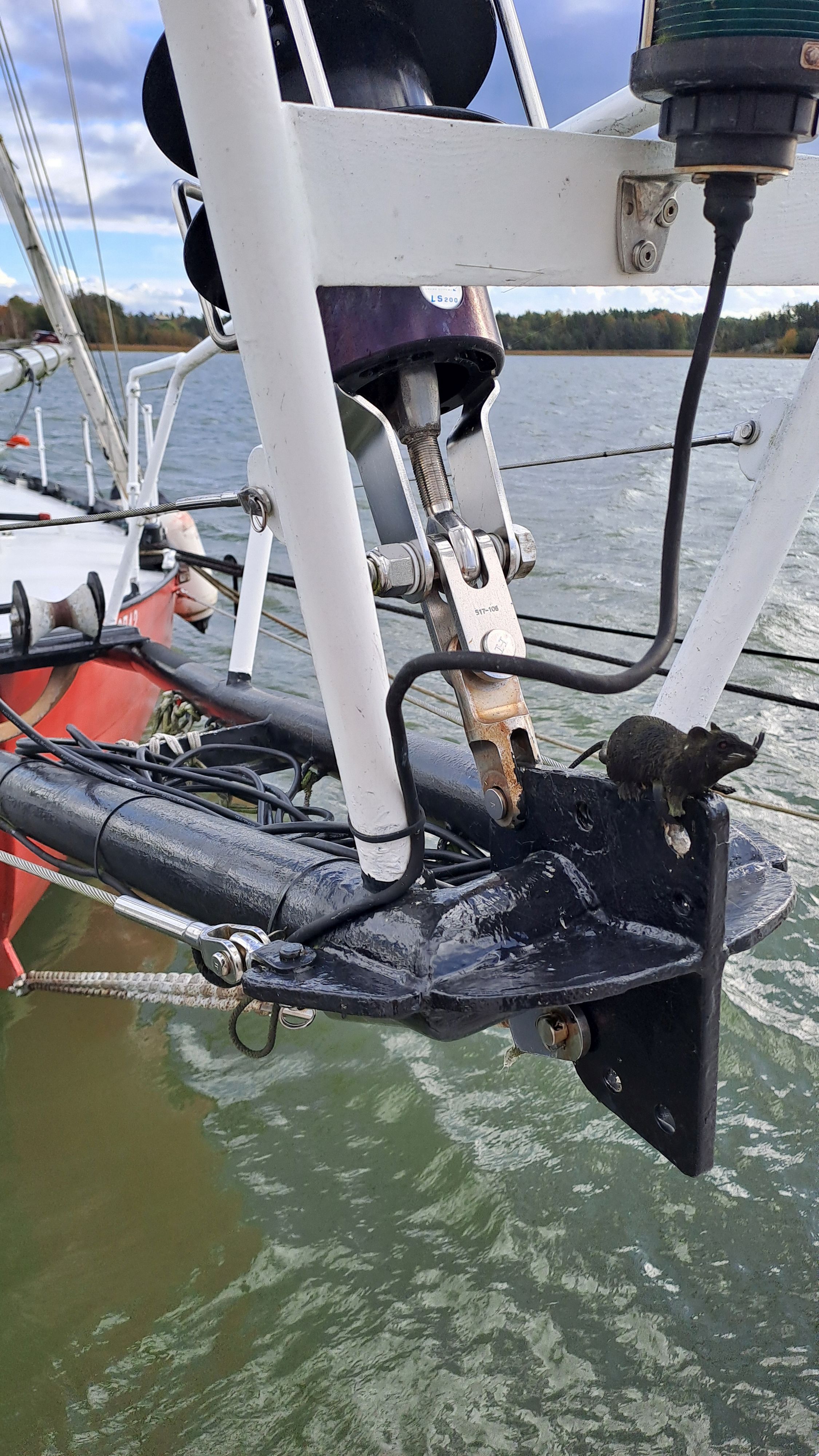 In newer generations, the servo rudder is "flip-up," but Terra Nova has the older model, where it must be removed manually. The servo rudder shaft and mounting sleeve are made of stainless steel. The boat also includes an aluminum "breakaway sleeve," designed to protect the system if it hits fishing nets. A spare servo rudder is stored in the bow locker.