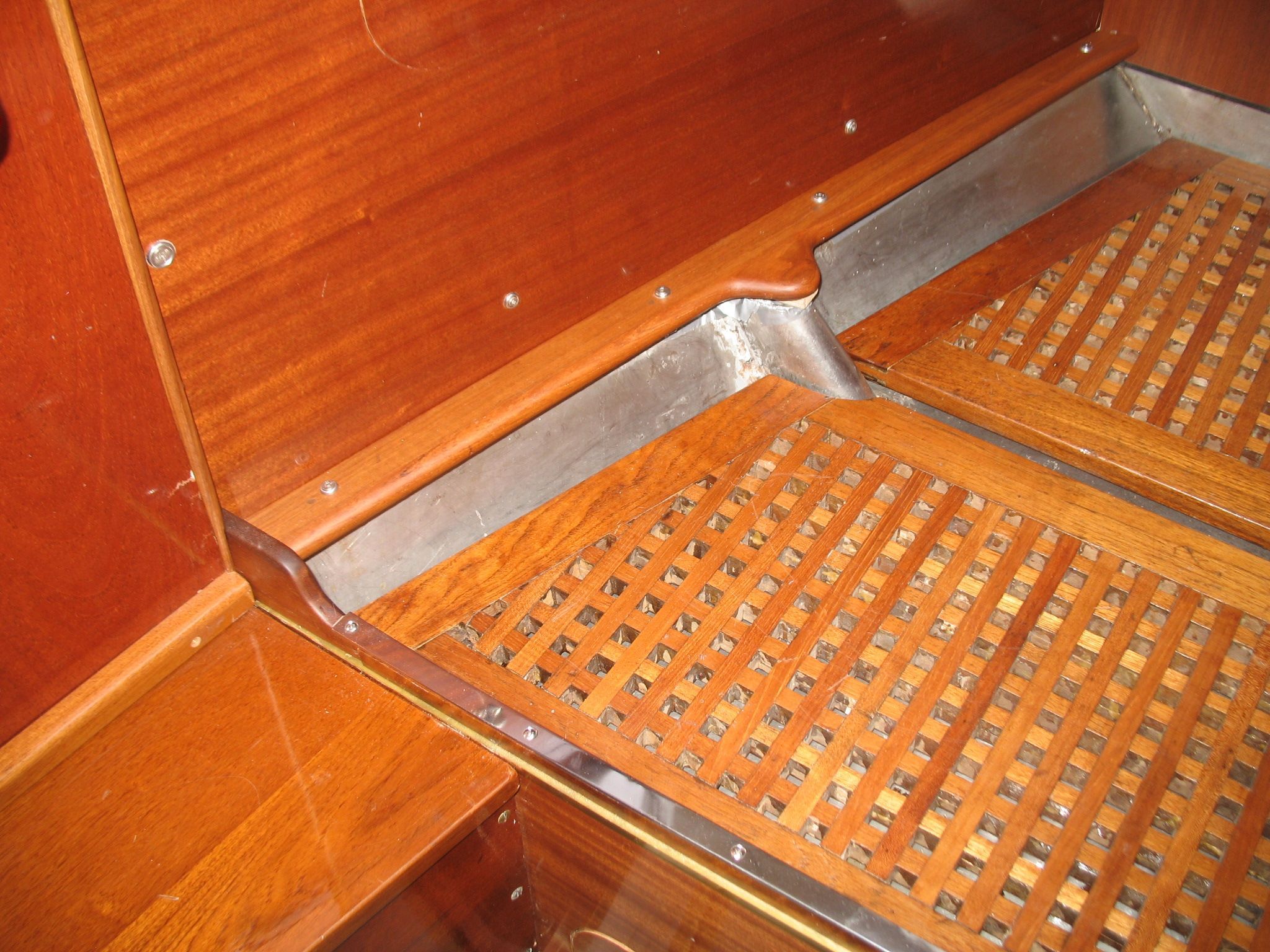 All pumps on the boat are manual. The water, fuel, and kerosene tanks are filled from the deck and have bronze screw caps.