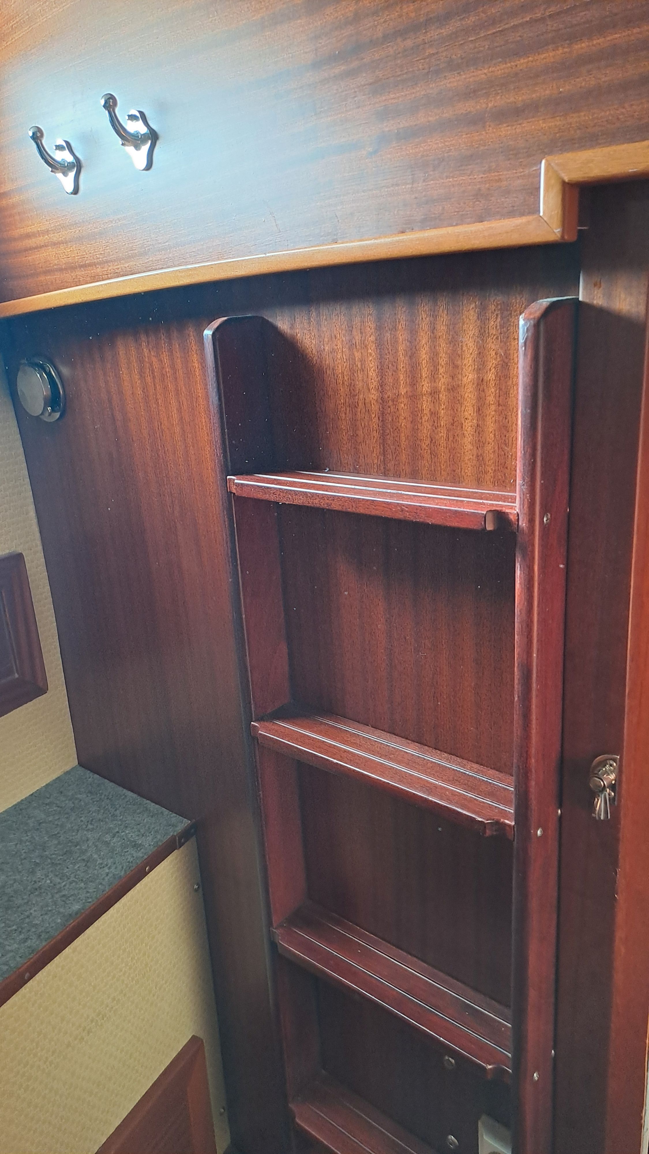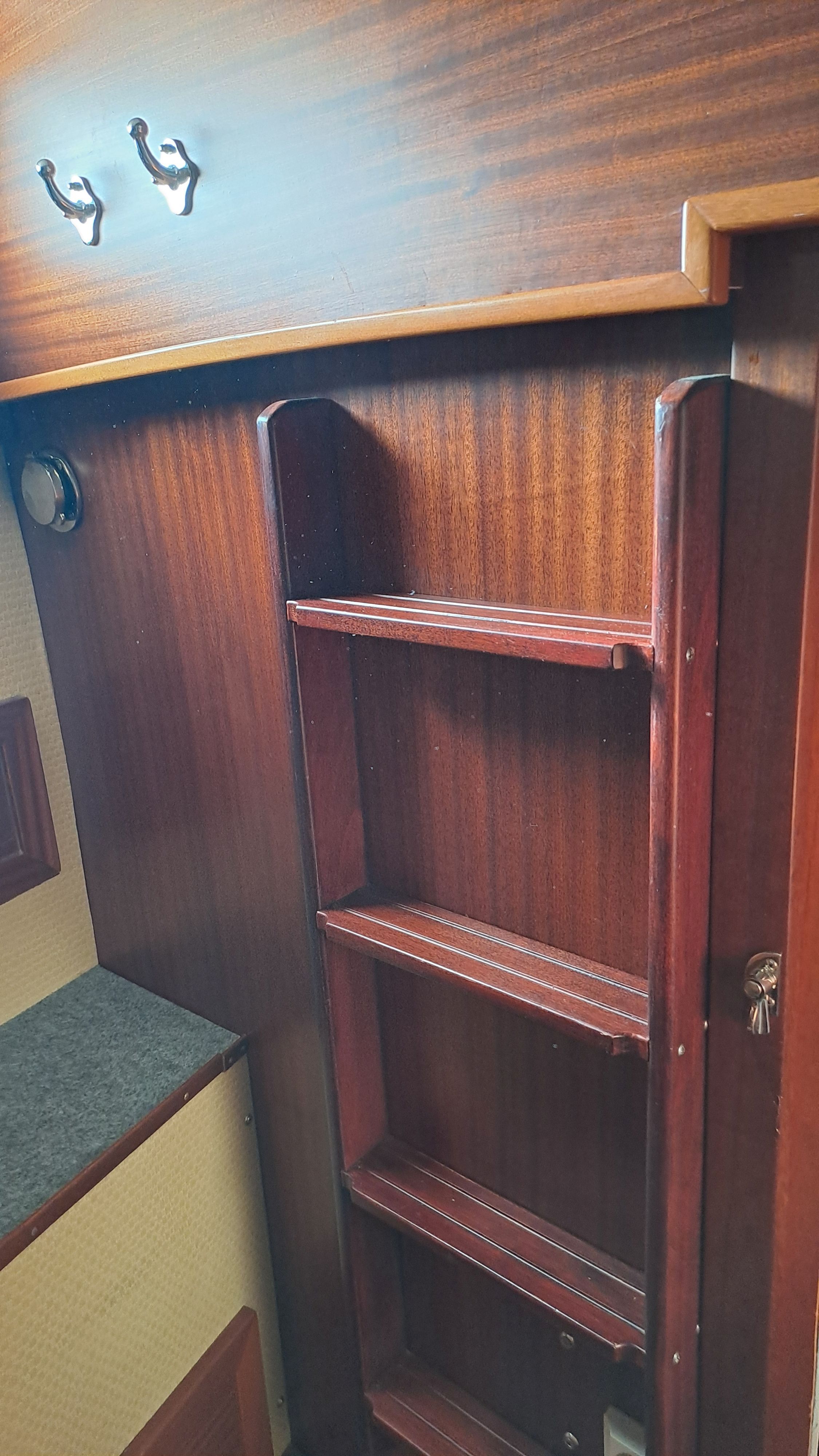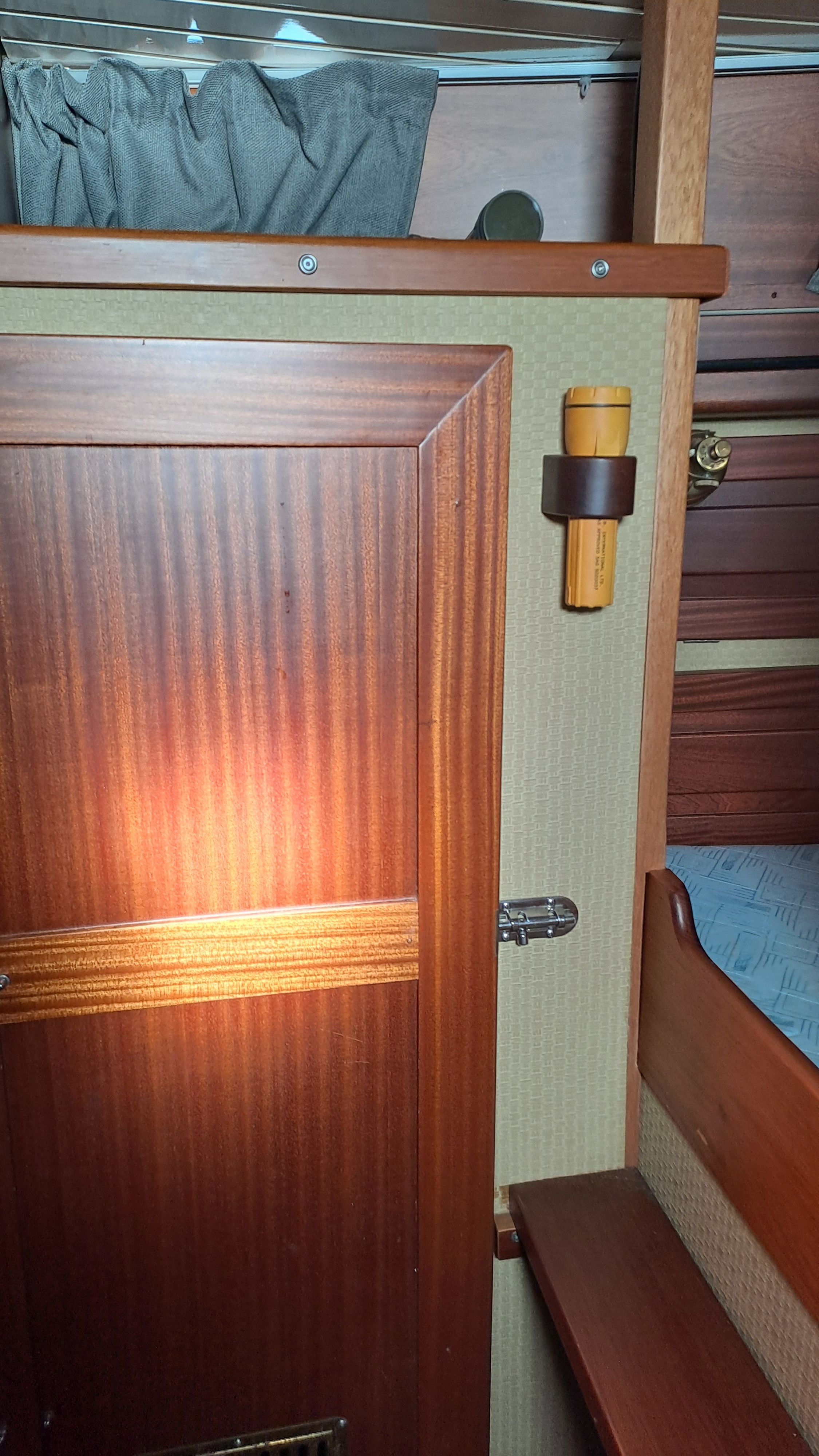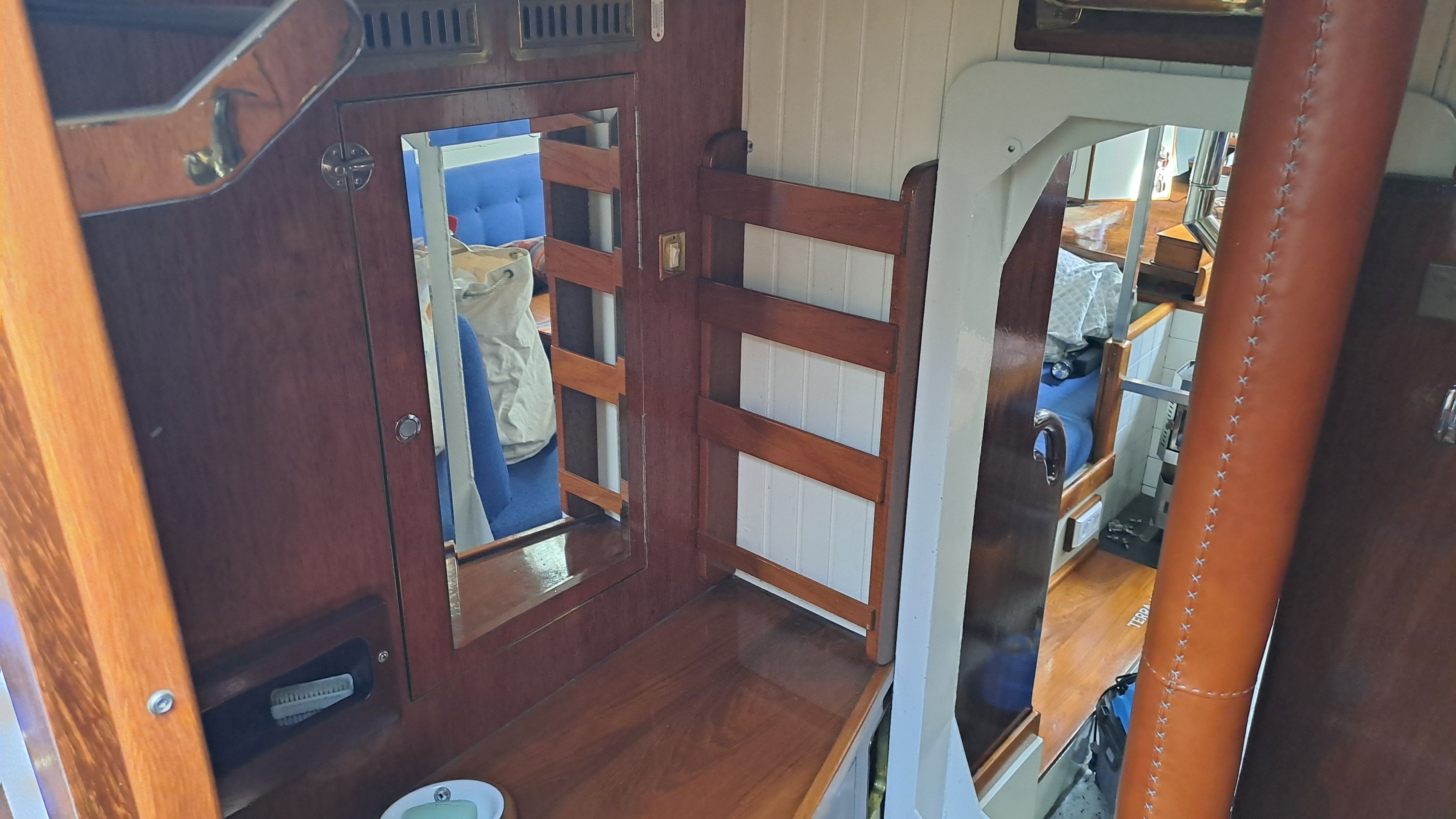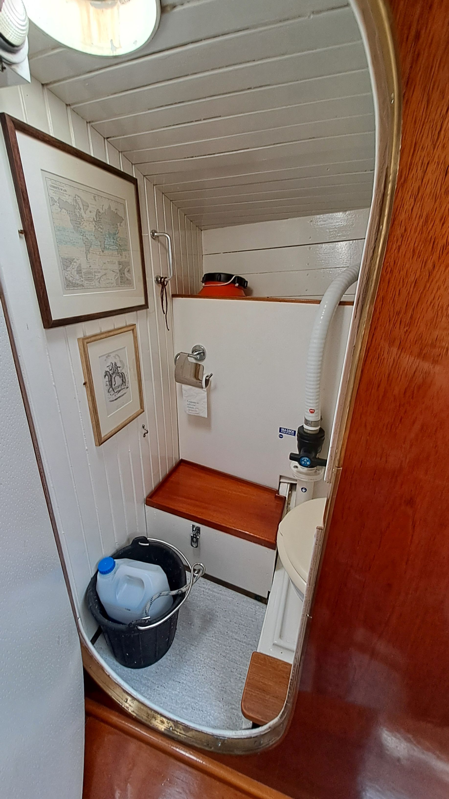 In rough seas, those who have used the toilet will appreciate the sideways “tightness” of the space. Opposite the toilet is a deep copper sink and a wardrobe.