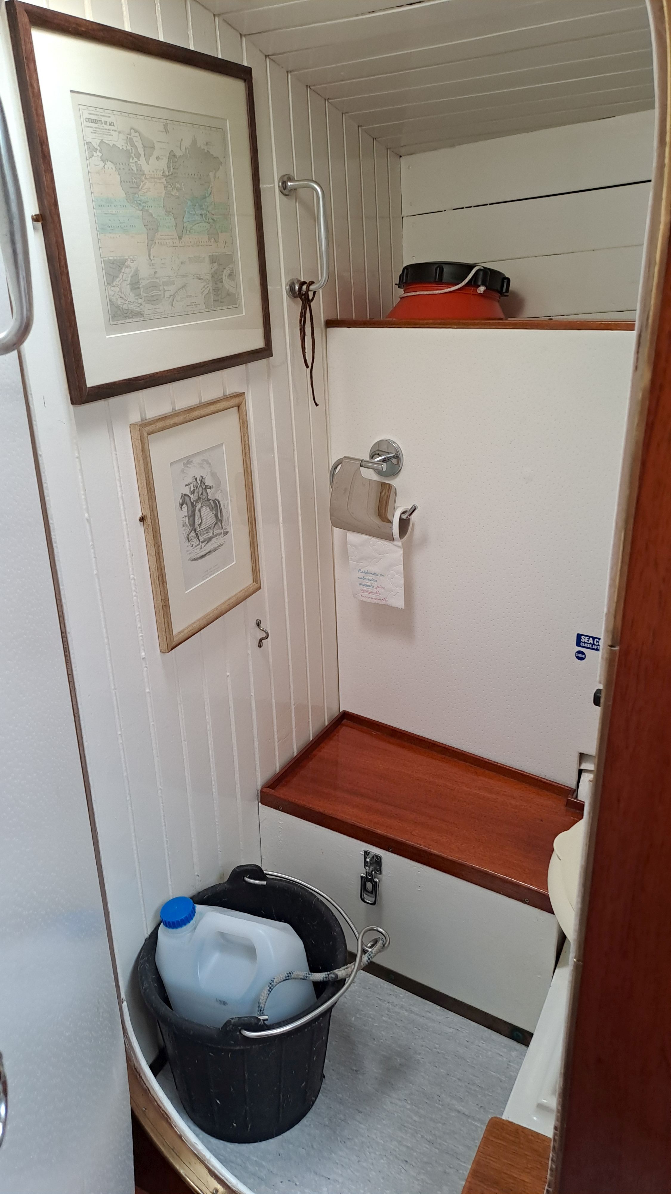 Under the teak grating, there is a stainless steel “basin” for wash water. The toilet bowl and flushing mechanism are made by Lavac. The bowl is vacuum-pumped. Compared to many other systems, its operation is very reliable, but using it requires some initial practice. The boat also has a spare toilet bowl cover with seals.