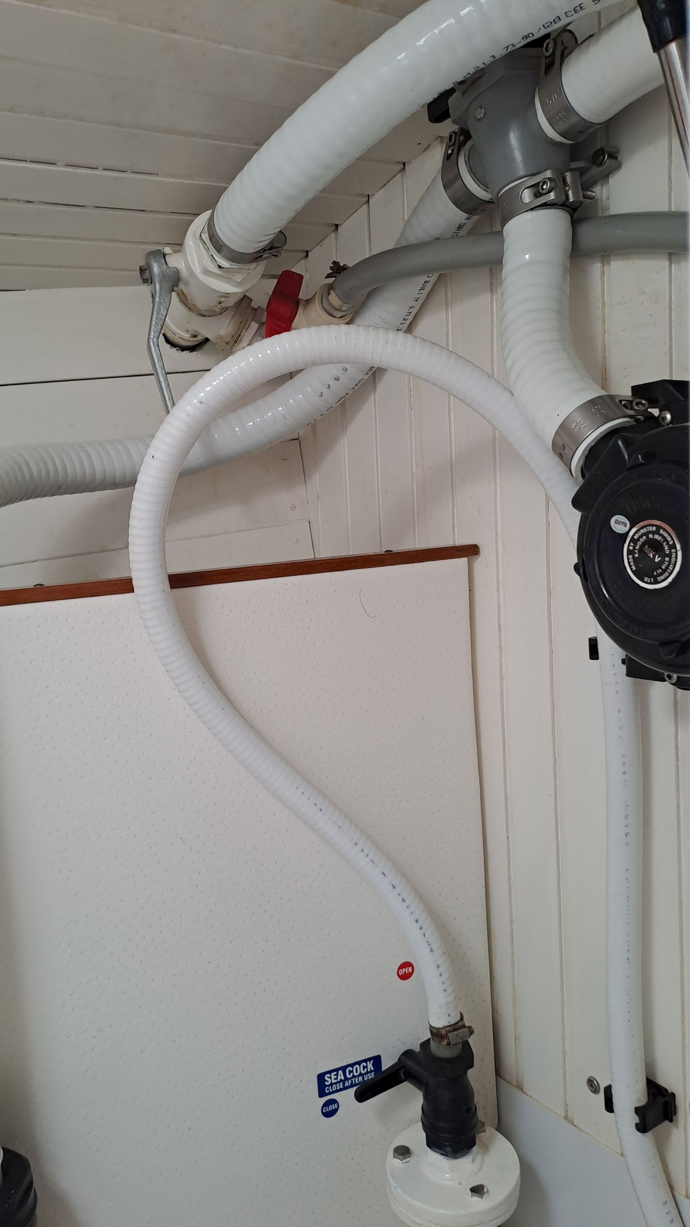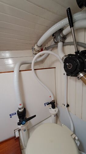 In the toilet, there are two pipes, with the solid pipe extending above the waterline. This allows them to be cleaned while the boat is in the water. Both ball valves are made of fiberglass-reinforced plastic by Forespar, and there have been no issues with them during winters when the boat has been in the water.