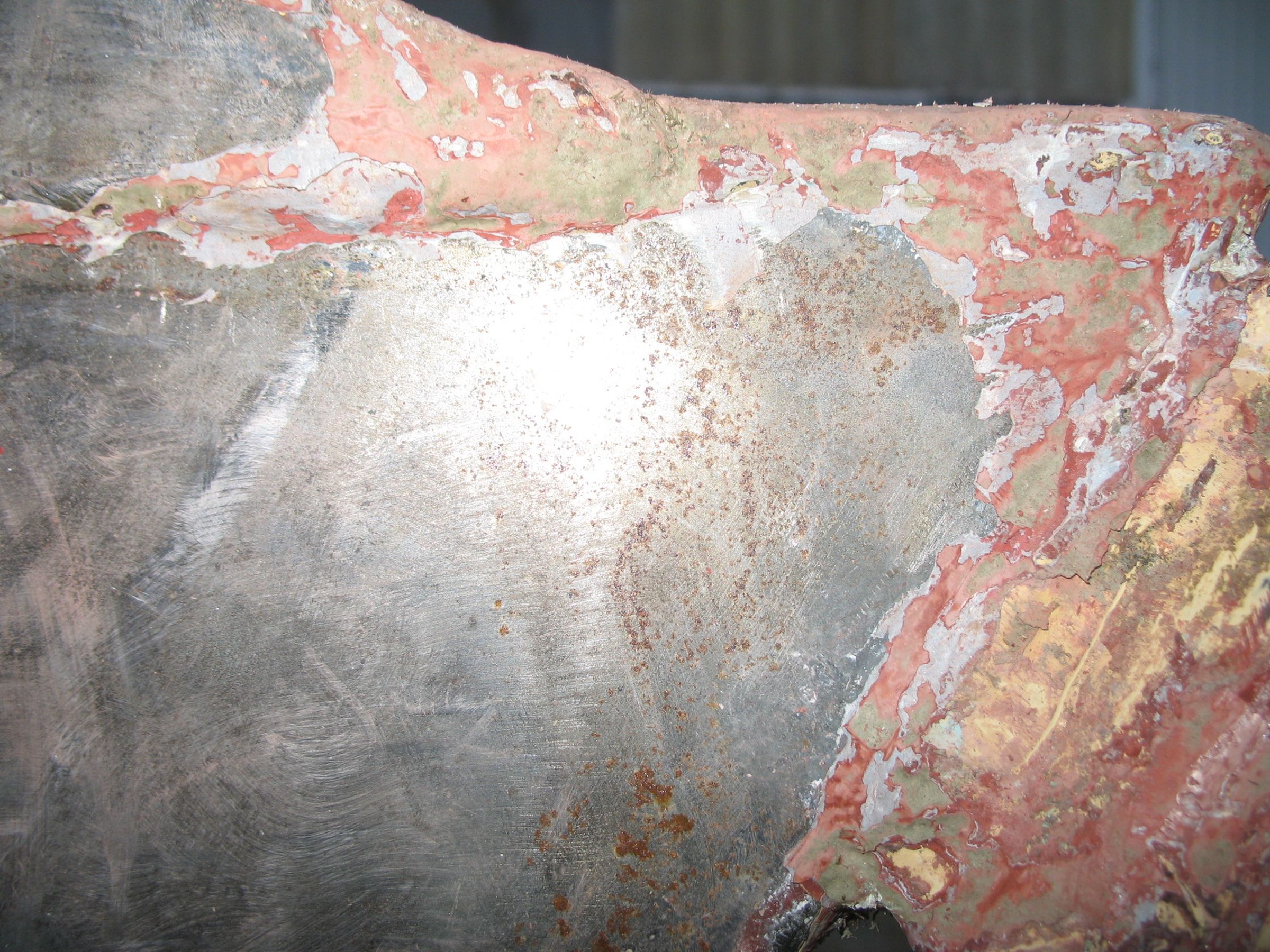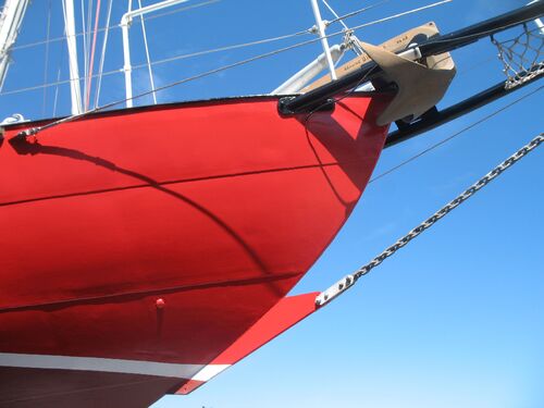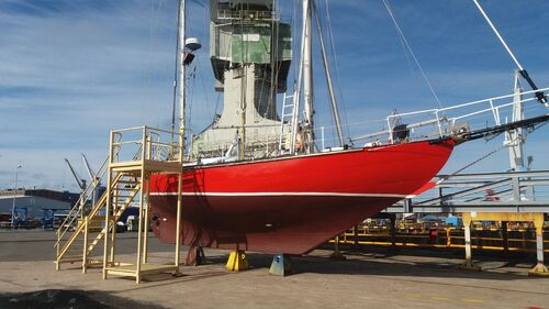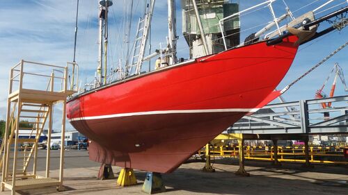 Fricaud used the same construction method in every Joshua, where the hull was welded in a rotatable "cradle." The hull is shaped like a wine glass, and the bottom of the keel is a flat 23 mm steel plate, which is 40 cm at its widest. The next plate upward is 15 mm, then 9 mm, and finally 6 mm all around. The steel plates run the entire length of the boat from bow to stern and are overlapped by 50 mm, with weld seams on both sides. In addition, there are frames every 50 cm, even though they are not structurally necessary. Moitessier's requirement was two watertight bulkheads. Inside the keel, steel ingots are stacked. The idea behind the construction was that if the yacht ran aground on a coral reef, the sailor could lighten the boat one ingot at a time and get free. The ballast is located under a welded grid, so it stays in place even if the boat capsizes. The entire hull is galvanized. The yard sandblasted the hull and then "sprayed" it with molten zinc. Since then, the boat has never been sandblasted again! Fricaud and Moitessier’s idea was that the hull wouldn't even be painted. Because of the galvanization, the paint peels off in large flakes, as shown in the photos, and can be gently removed with a wooden scraper. The photos probably say more about the condition of the hull.