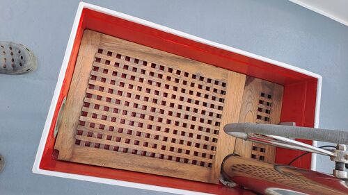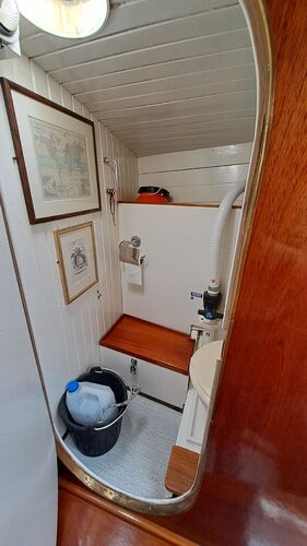 Water for the galley and the forward sink is pumped by foot pumps, which have spare parts available. The sink water can also be pumped out. Due to regulations, there is also a septic tank in the bow.