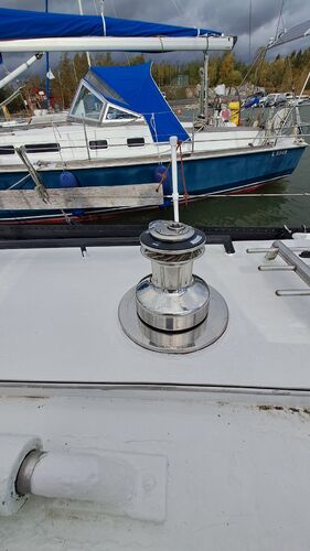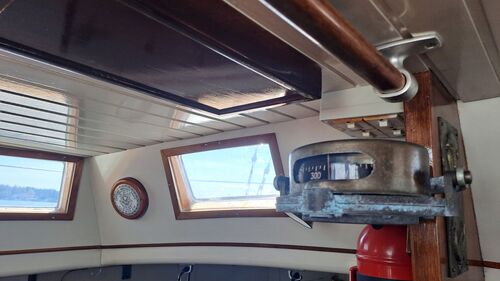 Behind the cockpit, there are two large Maxwell winches made of bronze. They were chrome-plated a few years ago. I recently acquired two stainless steel Andersen winches for the front of the cockpit, of which only one has been installed so far. The other could be mounted on the main mast, as hoisting the sail with the gearless Lewmar halyard winch can be tough on the shoulder when sailing solo.