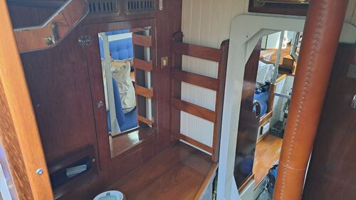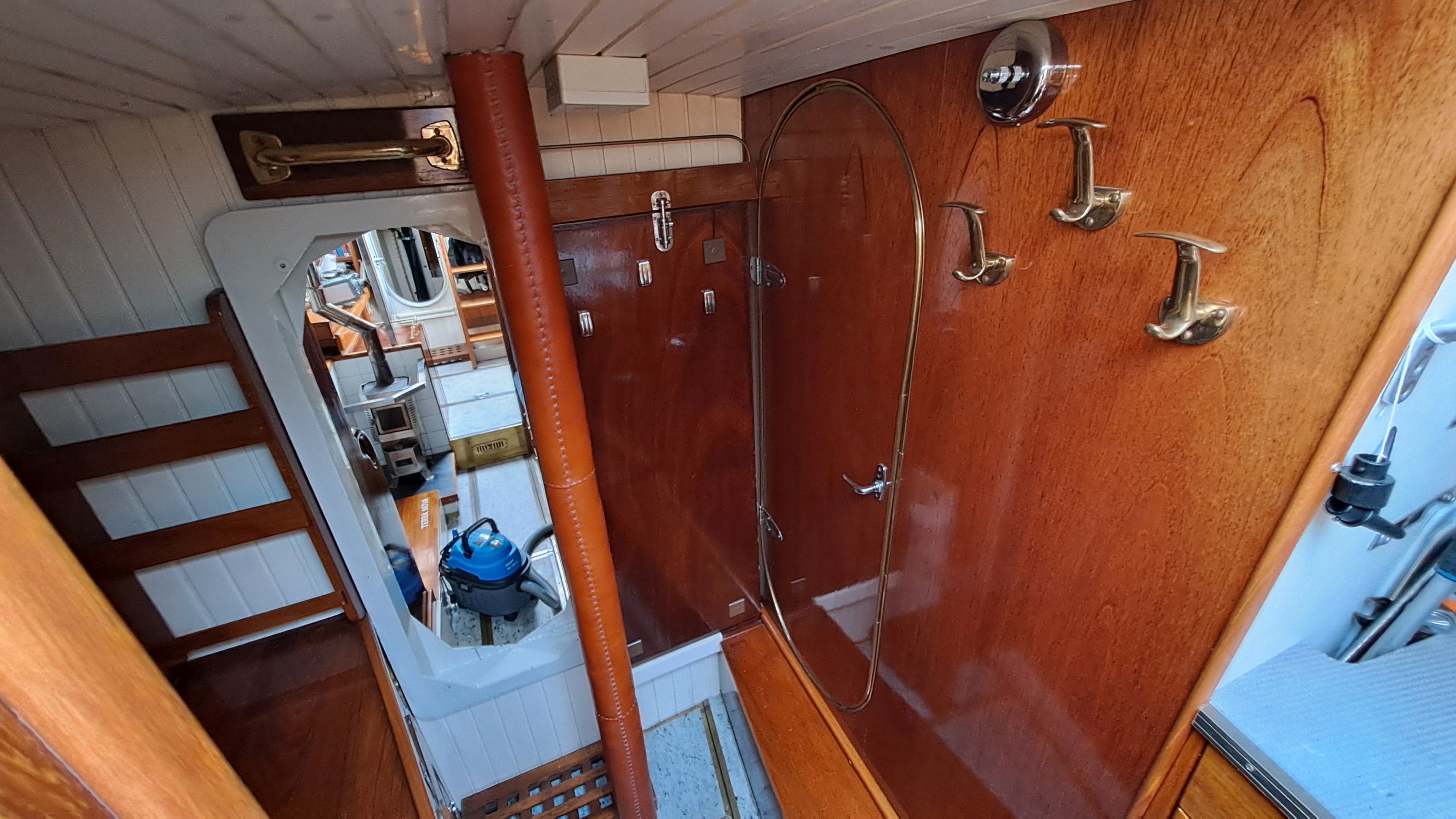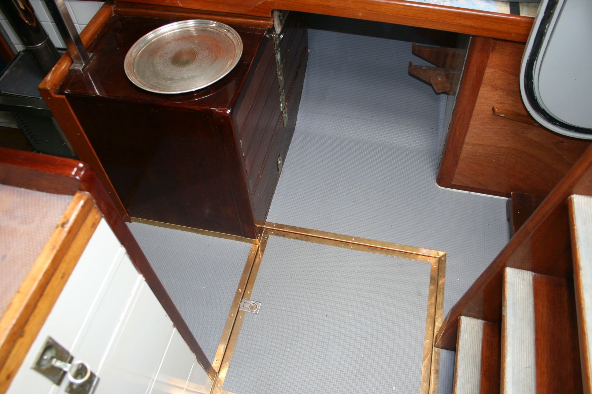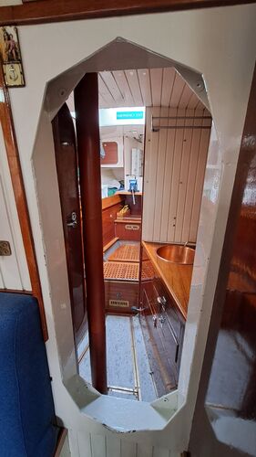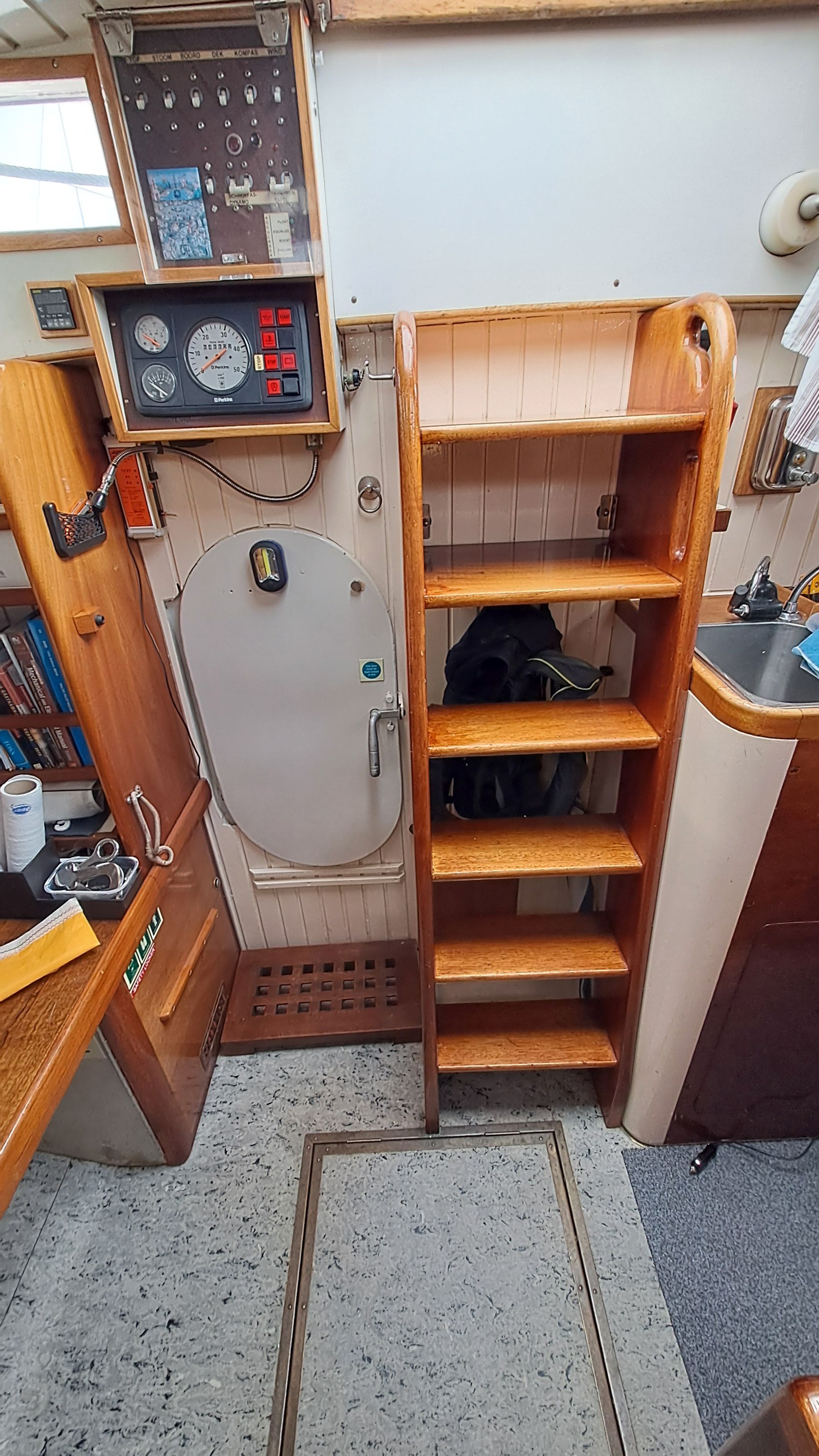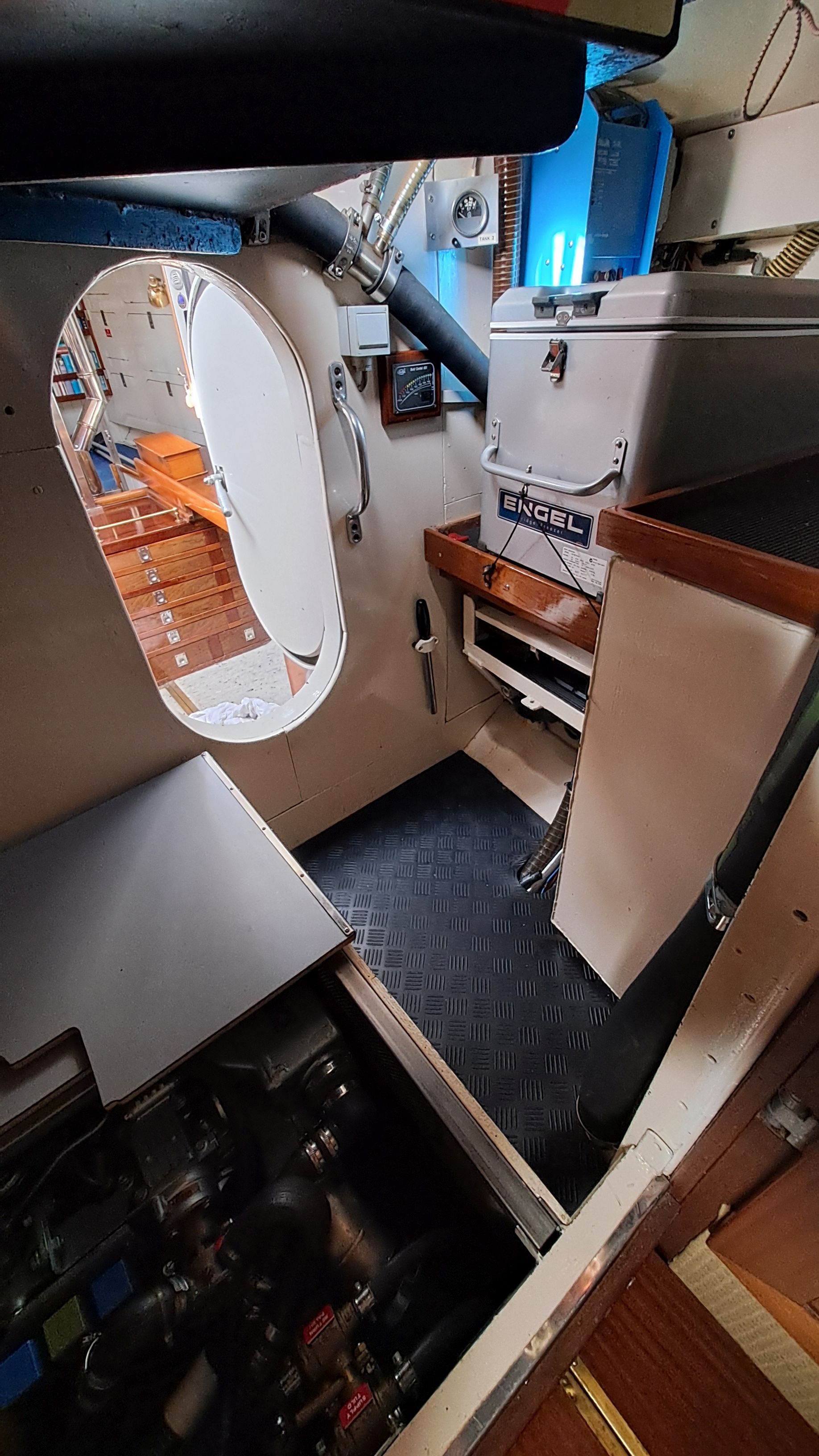 In the forward section, at the front end of the saloon, there is a removable door that is secured with four threaded bolts. Between the saloon and the engine room, there is a hinged steel door.