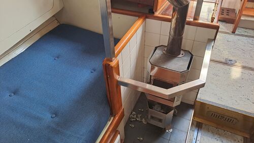 On the starboard side is the galley, equipped with a two-burner Primus kerosene stove. It runs on lamp oil—there is no gas on the boat! Next to the stove is a dedicated kerosene tank of about 30 liters, which can be filled through a deck pipe. Although the stove requires some know-how to operate, it means you don’t have to worry about refilling gas bottles. Plus, kerosene is available in every less-developed country.