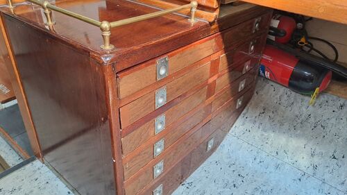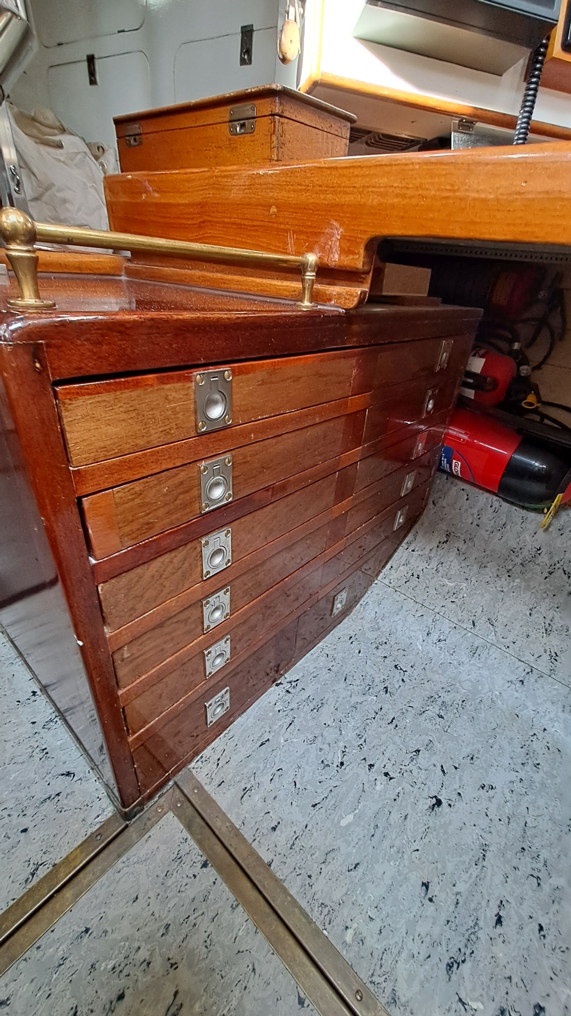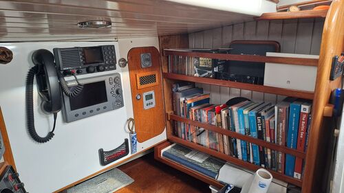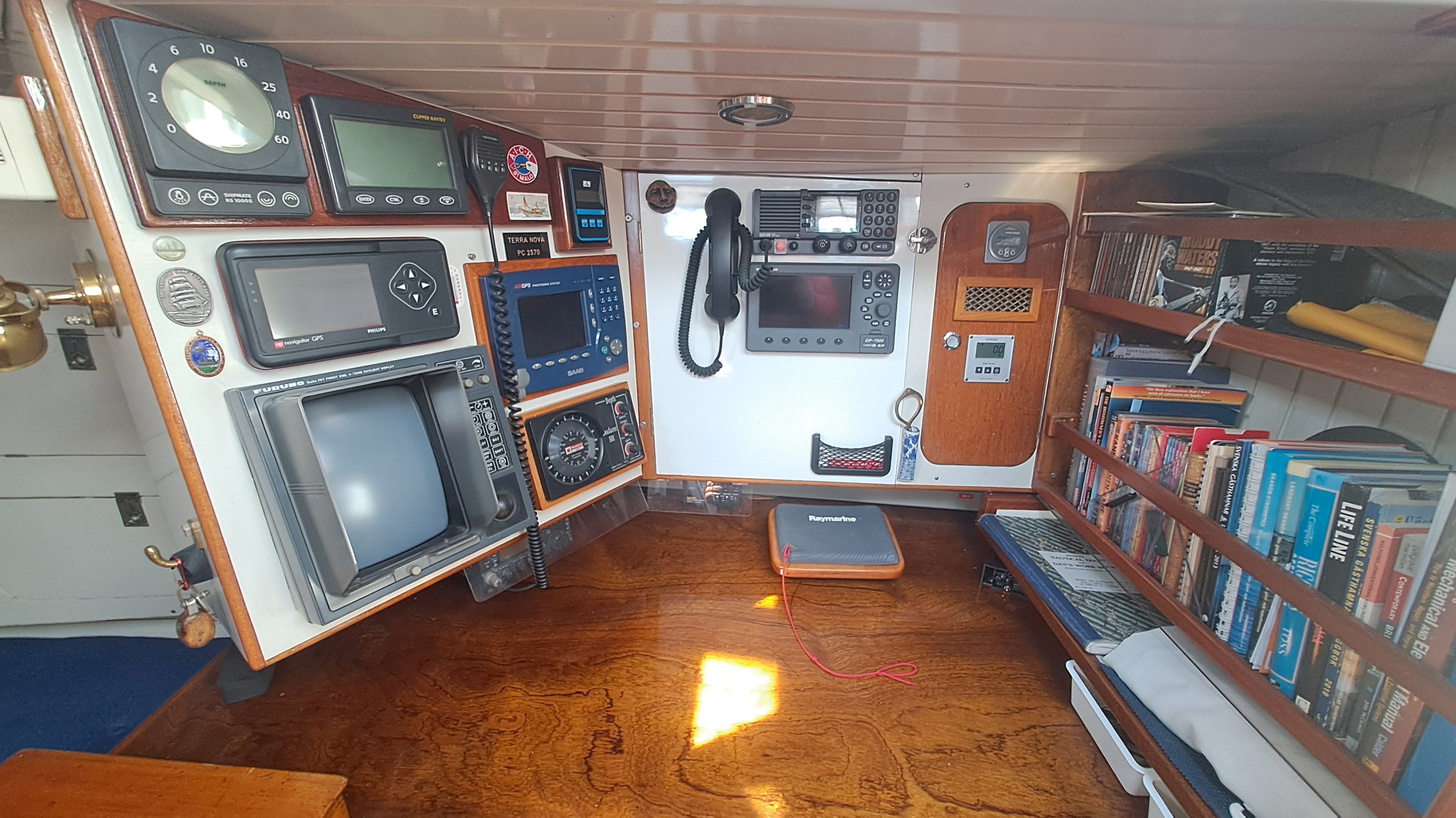 The full traditional marine chart can be opened on the chart table, which has five chart drawers underneath. Currently, the boat has three separate GPS units: two at the navigation station and a third at the steering wheel. There is nothing special about them.