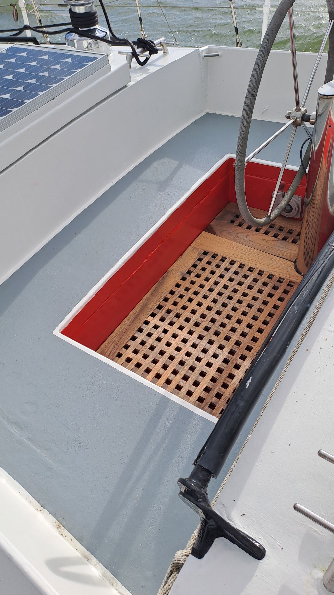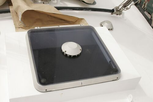 At the stern, there is an aluminum hatch that can also be secured from the inside, with a solar panel mounted on top. All three ventilation openings are Goiot and have rubber plugs that can be compressed into place for rough weather. One spare Goiot vent is included among the spare parts. The cockpit hatch has rails that allow it to slide forward, so it can be kept open or left slightly ajar.