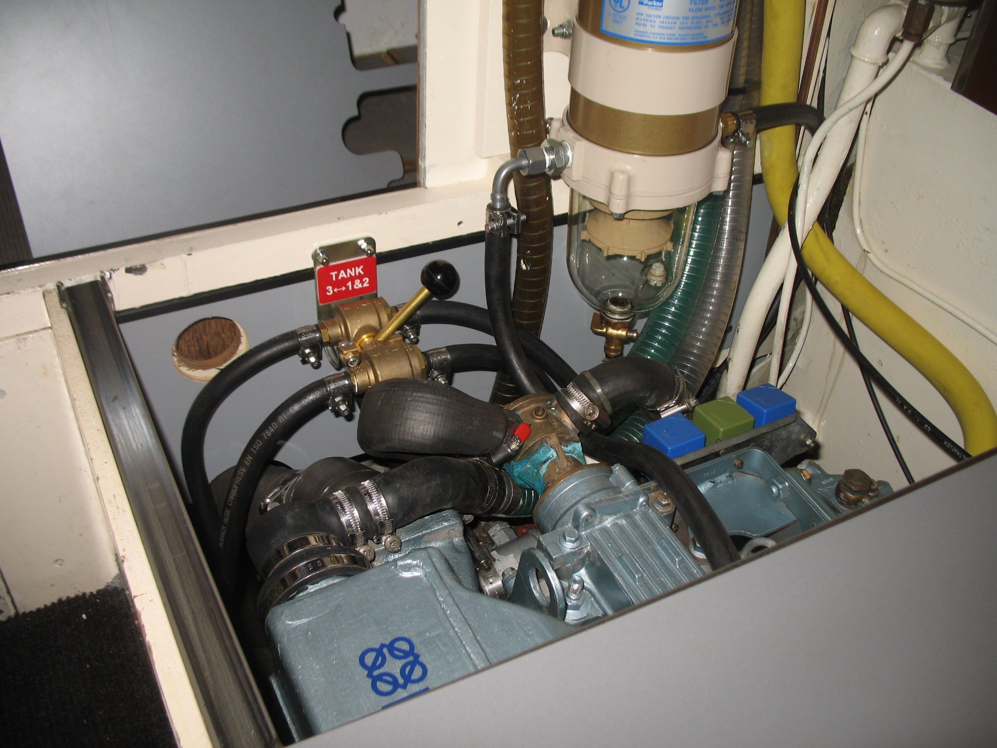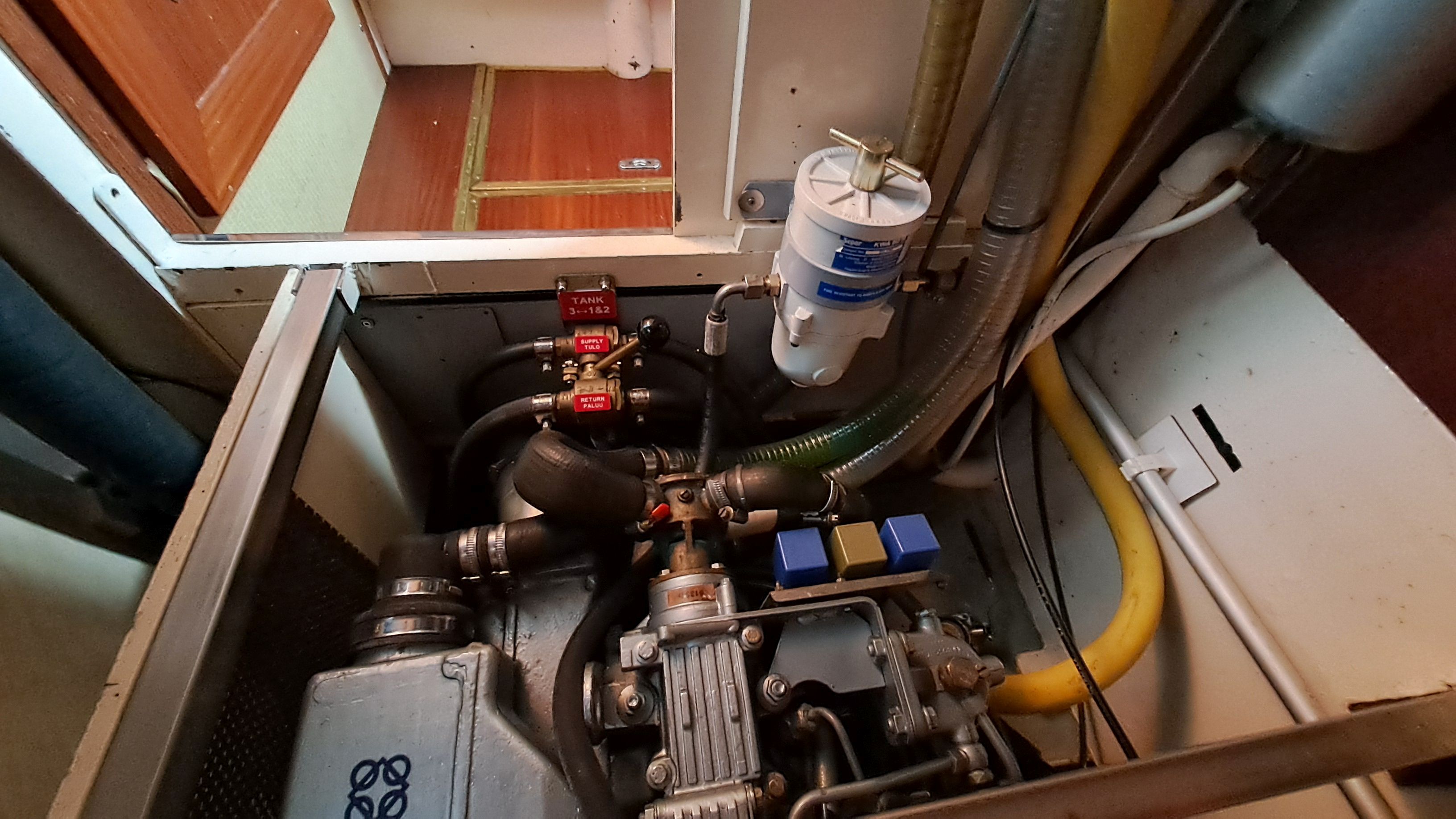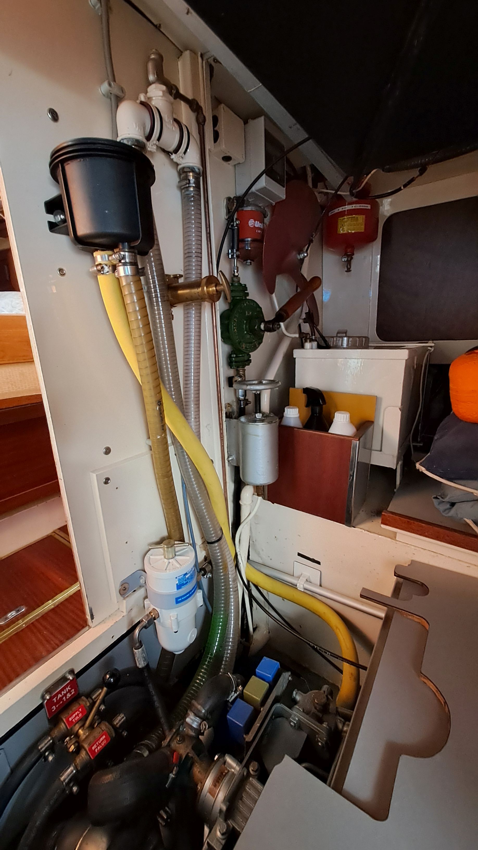 Above the large tank on the left side is a dedicated tank of about 40 liters for the Dickinson Alaska stove. Currently, there are only two fuel filters in the line, but in the engine room’s spare parts cabinet there is a U.S.-made “farm filter” ready to be installed if traveling in areas where fuel cleanliness is uncertain. The boat also has an uninstalled Racor 1000 filter with a filtration capacity sufficient for years. However, using it requires a booster pump, which is not expensive.