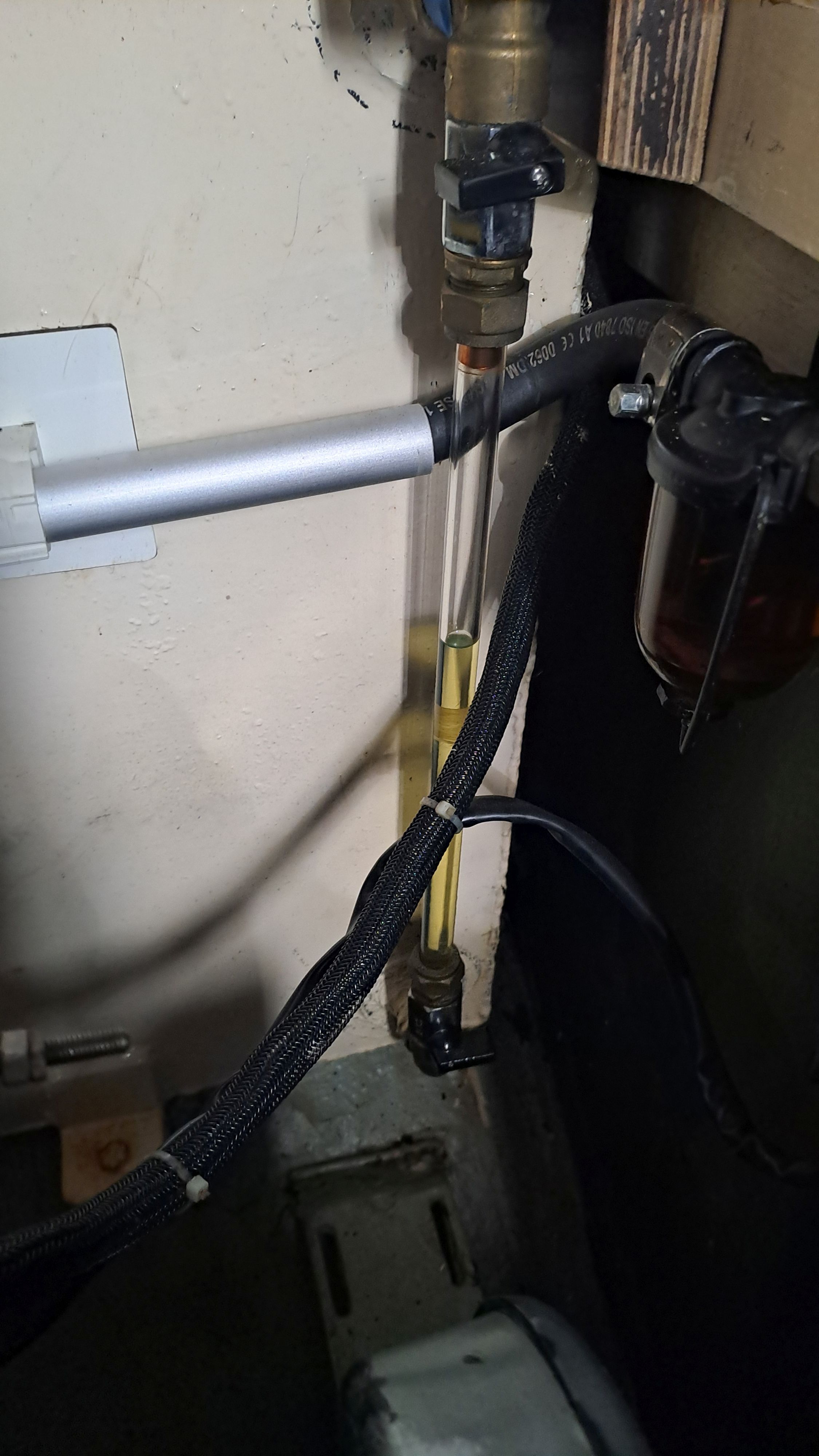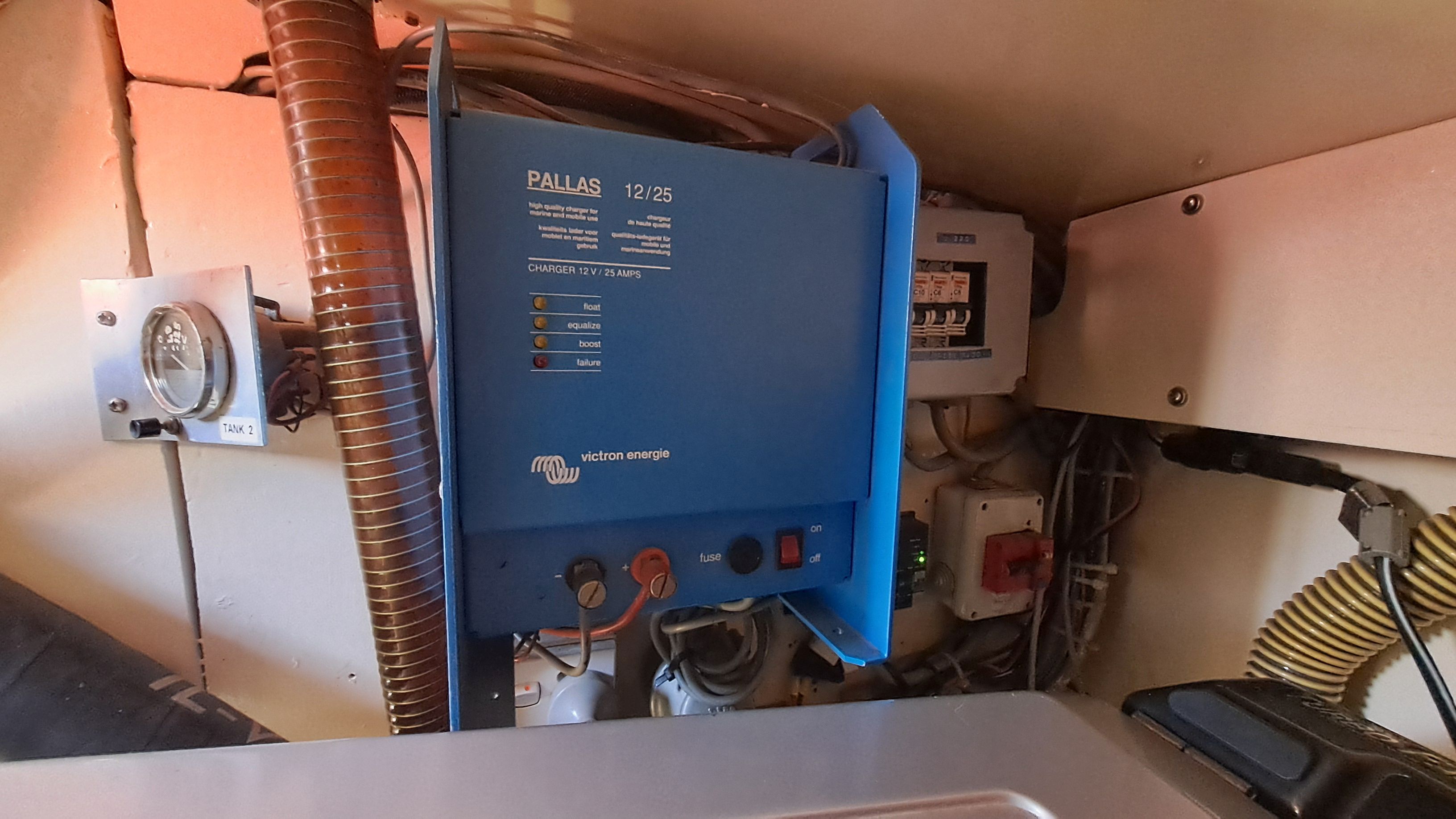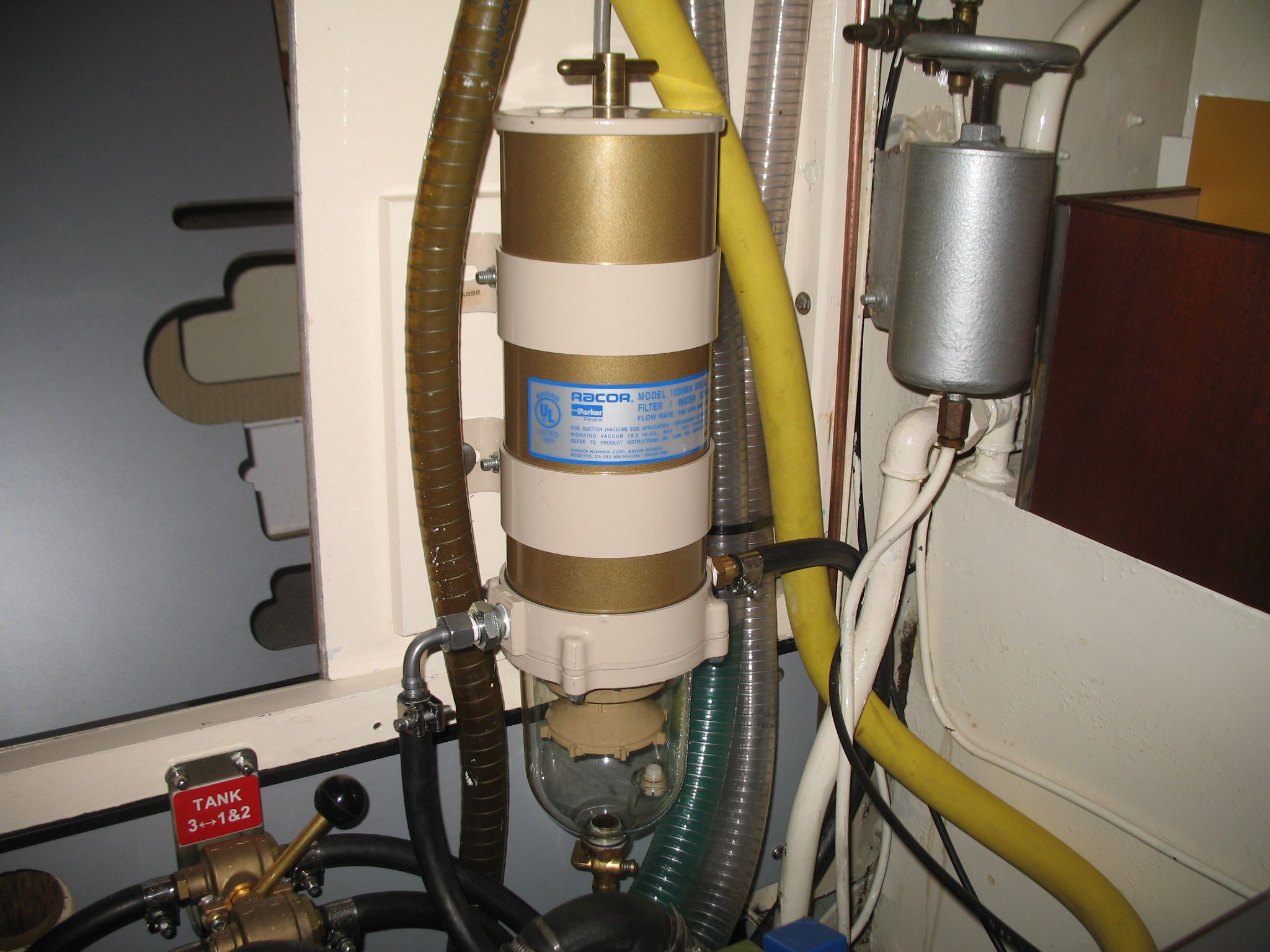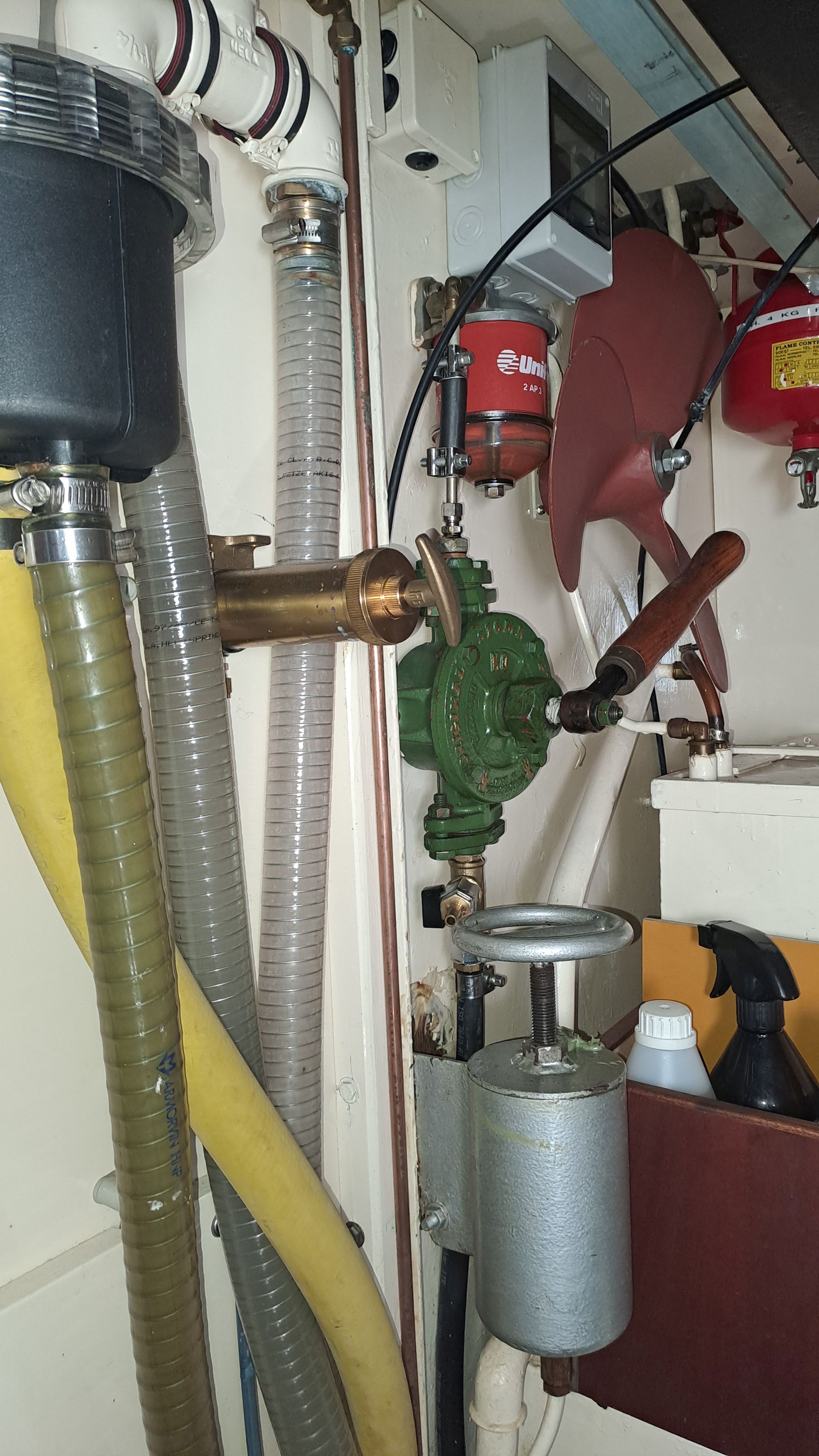 Above the large tank on the left side is a dedicated tank of about 40 liters for the Dickinson Alaska stove. Currently, there are only two fuel filters in the line, but in the engine room’s spare parts cabinet there is a U.S.-made “farm filter” ready to be installed if traveling in areas where fuel cleanliness is uncertain. The boat also has an uninstalled Racor 1000 filter with a filtration capacity sufficient for years. However, using it requires a booster pump, which is not expensive.