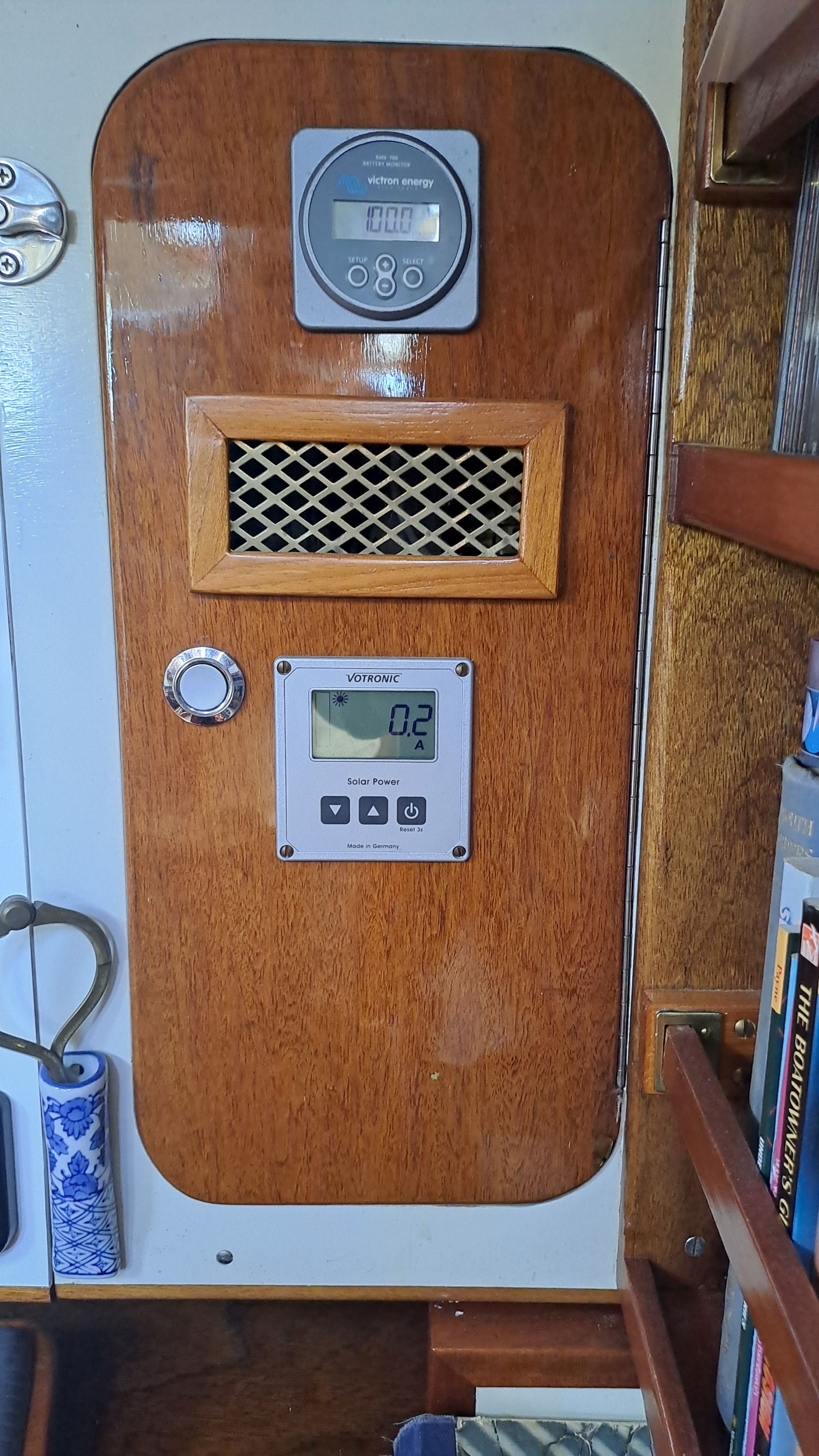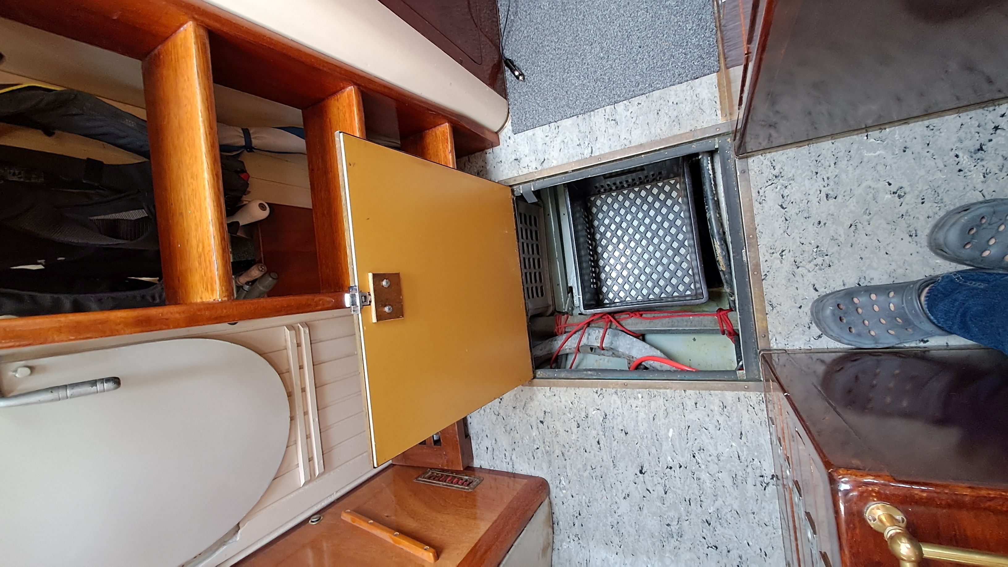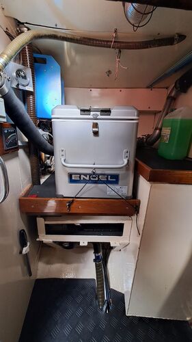 Under the galley is a “cellar.” There is no refrigerator in the galley. In the engine room, there is a high-quality compressor-powered cold chest. Without external electricity or solar panels, the Lifeline 215 Ah service battery has lasted three days at 50% discharge. I have never allowed it to go below that.