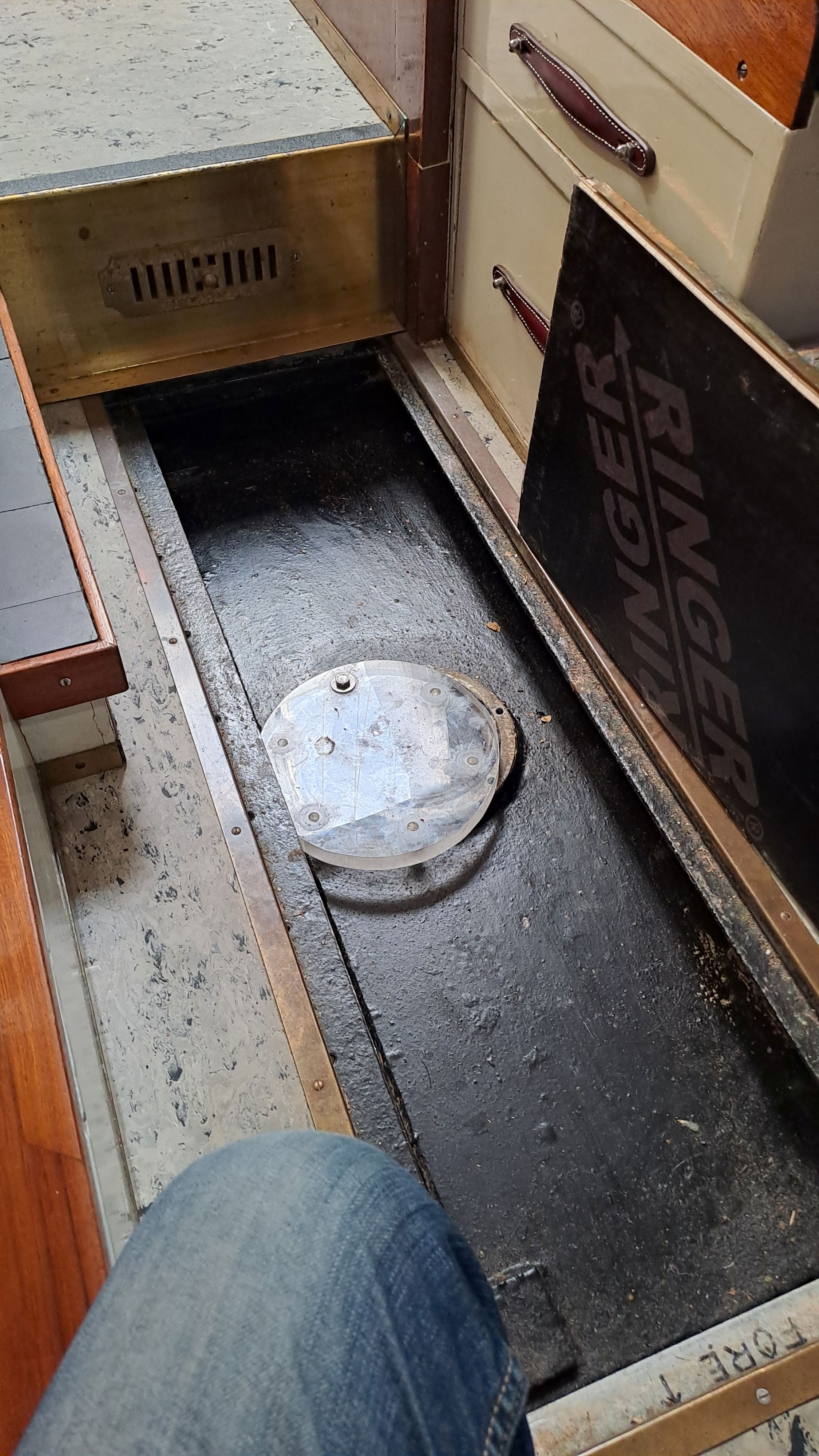 There are two deep sinks, supplied with water via a foot pump from the aft water tank through a filter. Both foot pumps are the same model, as are the four manual hand pumps on board.