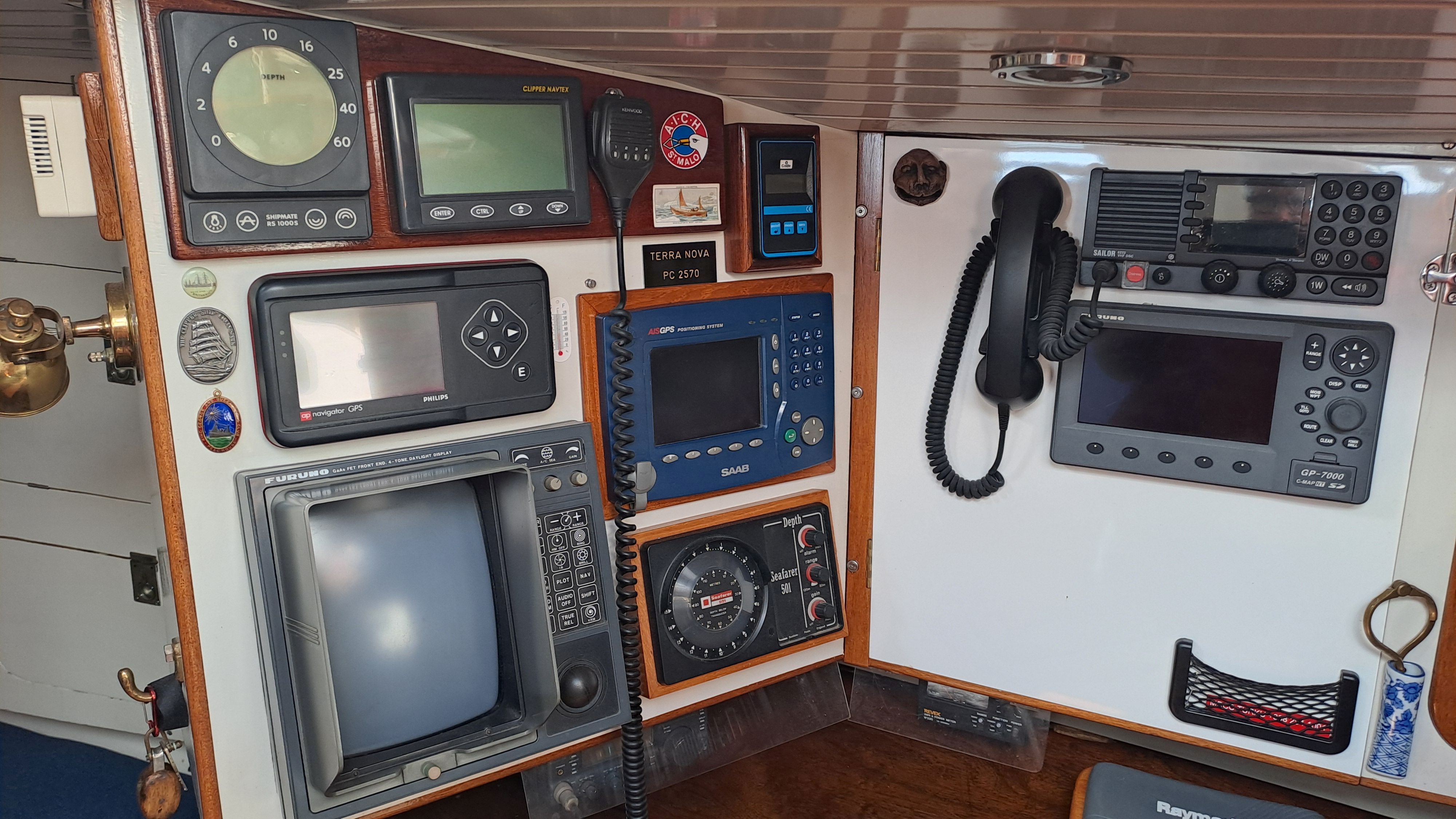 The boat is equipped with a SAAB AIS Class A unit, which has not been installed due to radio licensing restrictions. Class A is mandatory on the open ocean. Most sailers don’t realize that large vessels often block Class B data from their ECDIS devices, which means smaller boats are not be visible!