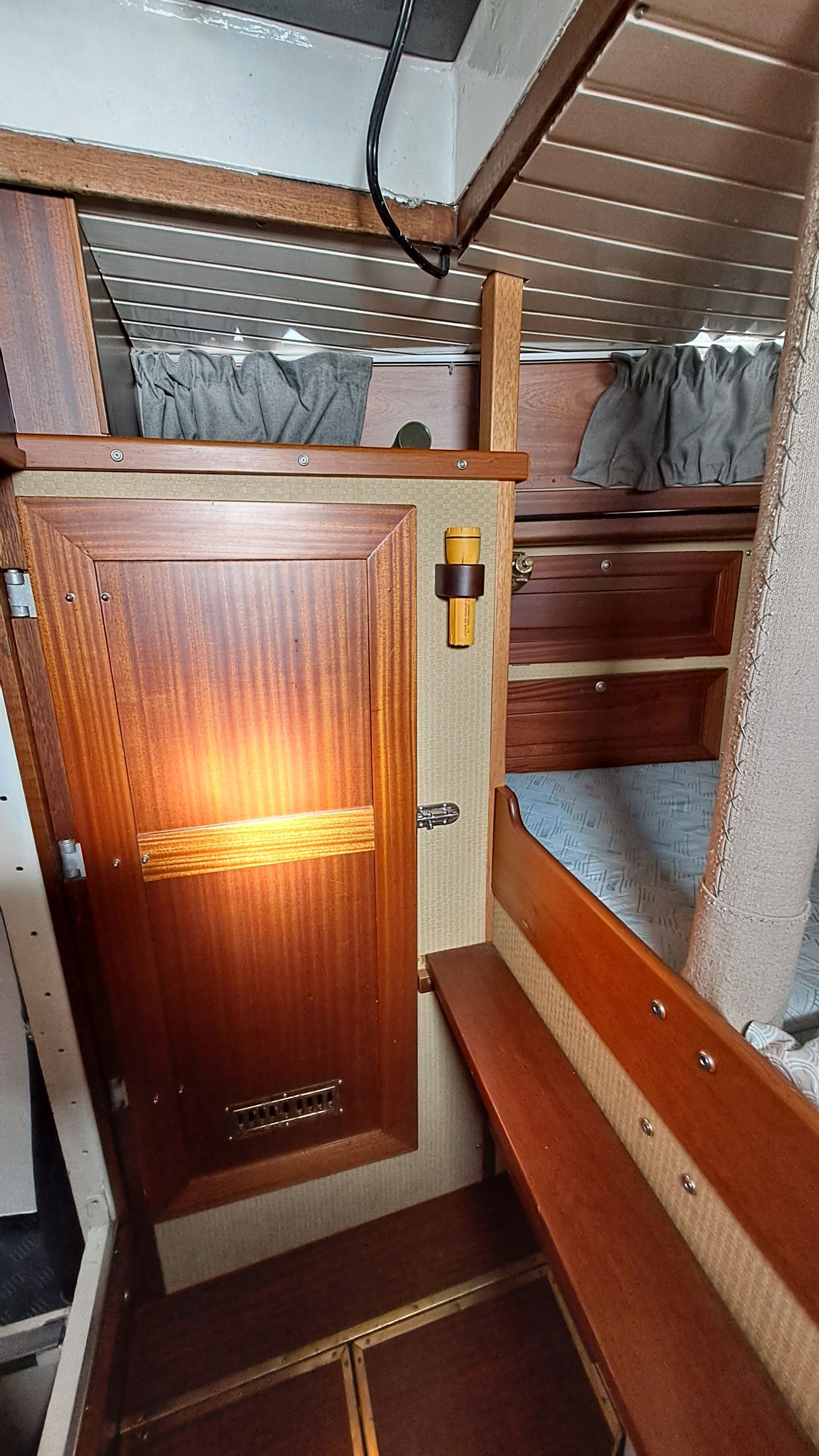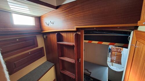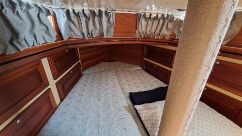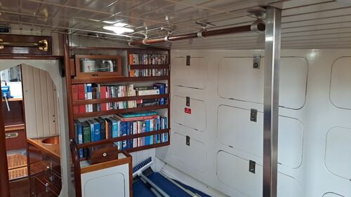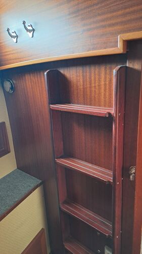 On the port side, there is a sea berth with a high removable railing, which is stored in the forward ceiling. The starboard sea berth is built so that the backrests can be moved onto supports. How to use it becomes clear on the boat.